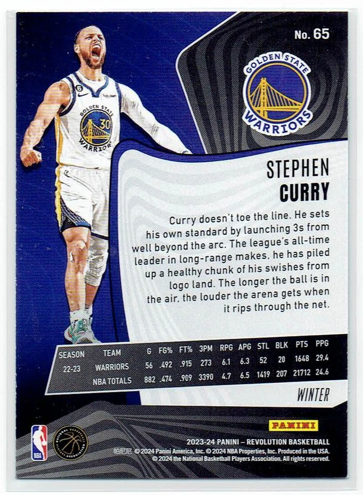Elevate your collection with the 2023-24 Panini Revolution Stephen Curry #65 Winter Holo card, a must-have for basketball aficionados and Golden State Warriors fans alike. This striking sports trading card captures the essence of the NBA superstar with its eye-catching Winter Holo parallel design, showcasing Curry's dynamic presence on the court.Crafted by Panini, the leading name in sports memorabilia, this card is part of the highly sought-after 2023-24 Revolution set. It stands as a tribute to one of basketball's greats, embodying the spirit of the sport in a collectible form. Whether for display or as a treasured keepsake, this card is an exceptional piece for any collection.