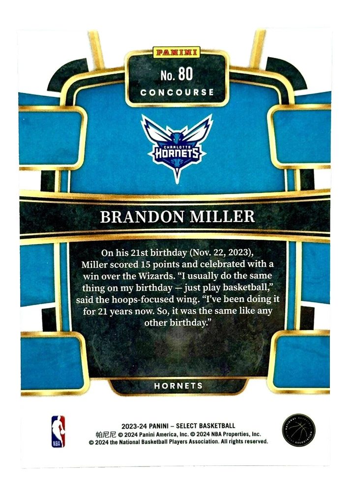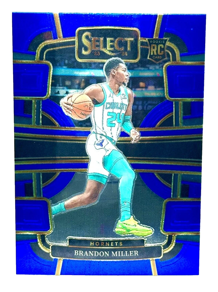 This 2023-24 Panini Select sports trading card features Brandon Miller, a rookie player from the Charlotte Hornets team. The card is part of the Concourse Light Blue Silver Prizm insert set and has a card number of #80. It is an original printing with a limited print run of SP. The card is made of 20 Pt. card stock and has a standard size. It is a great addition to any basketball fan's collection, especially those who are looking for a piece of memorabilia from the NBA Finals. The card is in excellent shape and is a must-have for collectors who appreciate rookie cards.