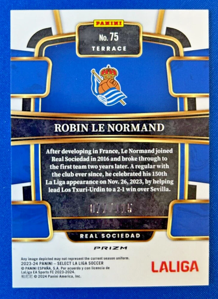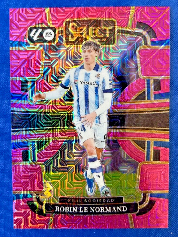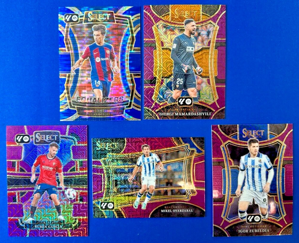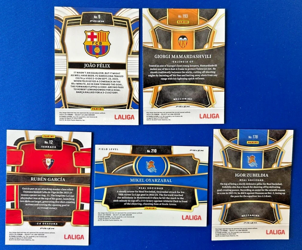 This 2023-24 Panini Select La Liga trading card features a multi-team/player design, including rookies Luka Modric, Mikel Oyarzabal, Robin Le Normand, Raphinha, Jorgen Strand Larsen, Giorgi Mamardashvili, Igor Zubeldia, Samu Costa, Ruben Garcia, Joao Felix, and Alejandro Balde. The card is numbered and has a purple prizm parallel/variety, making it a unique addition to any soccer fan's collection. The card is manufactured by Panini and is part of the 2023-24 Panini Select set. It is a sports trading card and is categorized under Trading Card Singles, Sports Trading Cards, and Sports Mem, Cards & Fan Shop. The card is in excellent shape, with a card condition of 400010. Get your hands on this amazing card and add it to your collection today!
