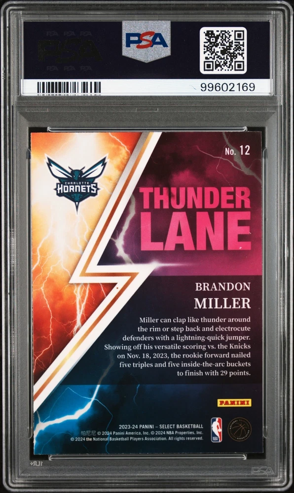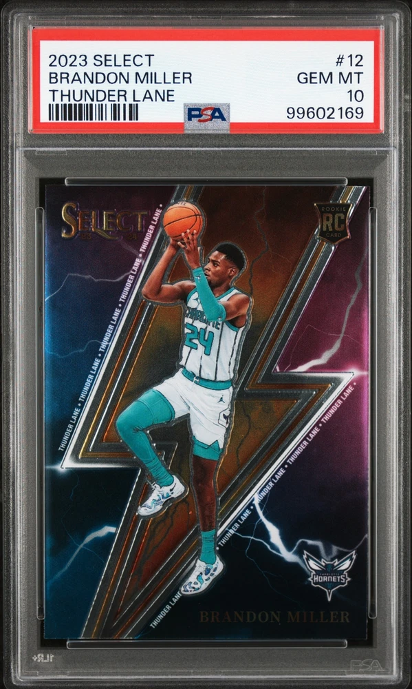 Brandon Miller 2023 Select Thunder Lane #12 Rookie RC PSA 9 All orders ship within 24 hours of payment. For Graded Cards you will receive the card(s) listed in the title and pictured in the scan, because at times we may have duplicates of the exact same grade card, you will receive the exact card and grade listed but certification number might be different. Graded cards will be put in a graded sleeve, wrapped in cardboard, and shipped in bubble mailer to ensure it arrives in pristine condition. For Ungraded Single Cards you will receive the exact card(s) listed in the title and pictured. Ungraded Single cards over $20 will be shipped the same way as graded cards Ungraded Single cards under $20 will be shipped in a toploader and team bag using eBay standard envelope, if you would prefer to have it shipped with more protection in bubble mailer, please send us a message and we can provide an updated shipping quote for you. RETURN POLICY : We allow returns with full refunds but do not offer partial refunds. Returns are available to our customers if they did not get the item they are intended to receive. They are not for them to buy and decide they do not want them. 1. Items returned because of damage, missing parts, wrong item sent, will be given full refunds 2. Items returned because of buyers remorse, changed my mind, found better price, just didn't like it will by charged a minimum of 20% restocking fee SALES TAX : Sales tax is charged in accordance w/all of eBay's policies and the state where the item is being sent. ADDITIONAL INFORMATION : We are actively accepting ebay consignments, please message us for any inquiries. THANKS FOR LOOKING AND PLEASE MESSAGE US WITH ANY QUESTIONS! Check out our other eBay listings by clicking this link: TopShop828 eBay Store !