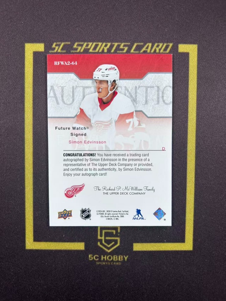 The product is a 2023-24 SP Authentic Retro Future Watch autographed card featuring Simon Edvinsson of the Detroit Red Wings in the National Hockey League (NHL). This rookie card is a part of the original set released by Upper Deck and is made of card stock with a hard-signed autograph. The card is a parallel variety of retro design, perfect for collectors looking to add a unique piece to their sports trading card collection. With only 99 copies available, this limited edition card is a valuable addition to any hockey fan's memorabilia.