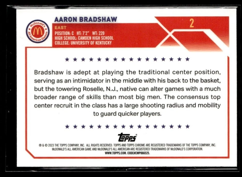 Game: Unspecified Year Manufactured: 2023 Card Size: 3¾" x 2¾" Autographed: No Manufacturer: Topps Franchise: Basketball Character: Aaron Bradshaw Vintage: No Card Name: 2023-24 TOPPS CHROME AARON BRADSHAW MCDONALD'S ALL AMERICAN #2 Player/Athlete: Aaron Bradshaw Type: Sports Trading Card Sport: Basketball Set: Topps Chrome Original/Licensed Reprint: Original Season: 2023 Card Number: 2 Team: McDonald's All American Graded: No