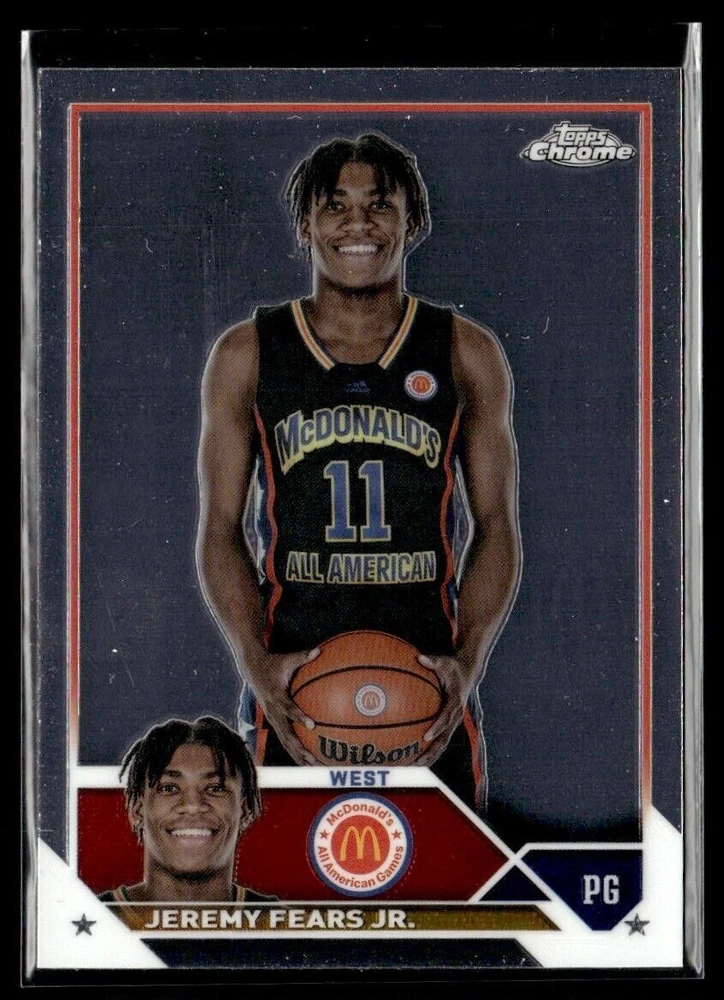 Character: Jeremy Fears Jr. Team: McDonald's All American Sport: Basketball Autographed: No Original/Licensed Reprint: Original Card Number: 65 Card Name: 2023-24 TOPPS CHROME JEREMY FEARS JR. MCDONALD'S ALL AMERICAN #65 Vintage: No Card Size: 3¾" x 2¾" Season: 2023 Manufacturer: Topps Franchise: Basketball Player/Athlete: Jeremy Fears Jr. Year Manufactured: 2023 Graded: No Game: Unspecified Set: Topps Chrome Type: Sports Trading Card