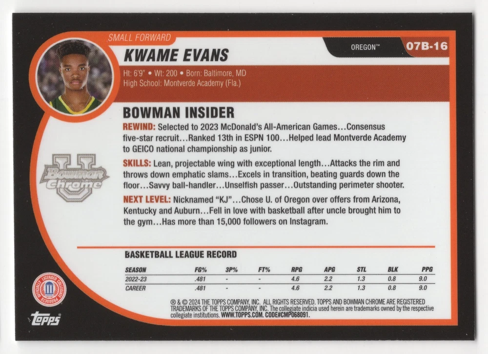 Original/Licensed Reprint: Original Card Name: Refractor Features: Parallel/Variety, Rookie, Short Print Set: 2024 Topps Bowman Chrome U Vintage: No Language: English Material: Card Stock Team: Oregon Ducks Card Number: 07B-16 Season: 2023-24 Country/Region of Manufacture: United States Autographed: No Manufacturer: Topps Card Size: Standard Year Manufactured: 2024 League: National Collegiate Athletic Association (NCAA) Type: Sports Trading Card Sport: Basketball Parallel/Variety: Refractor Player/Athlete: Kwame Evans