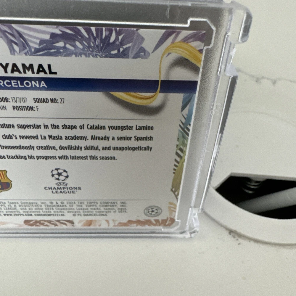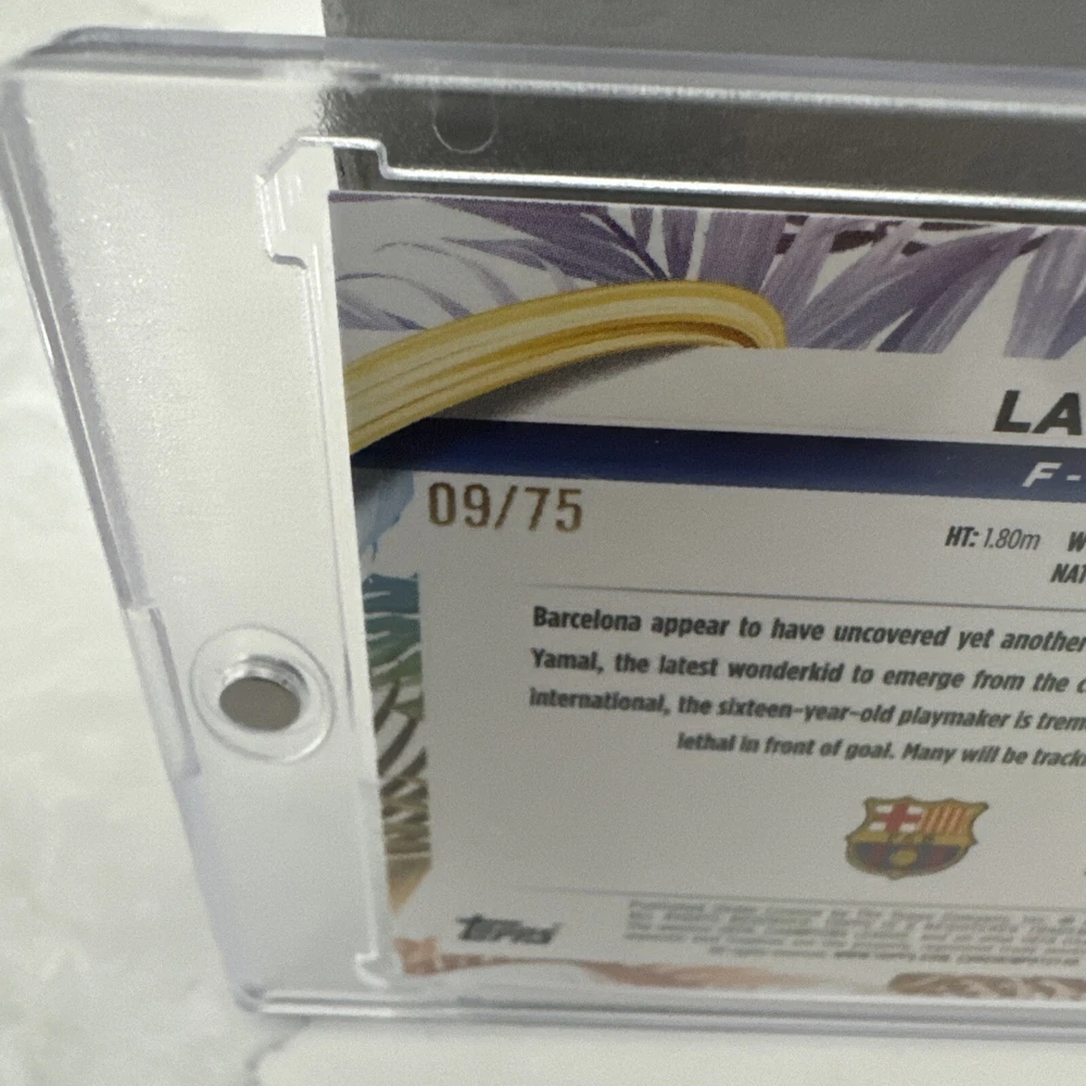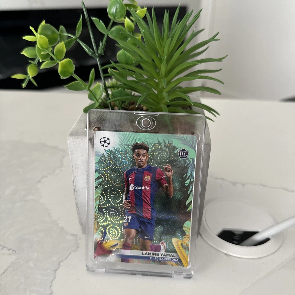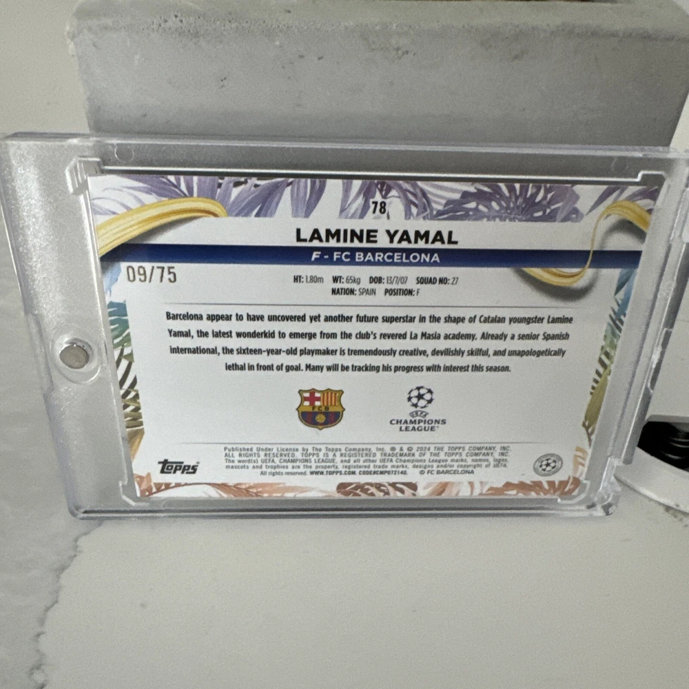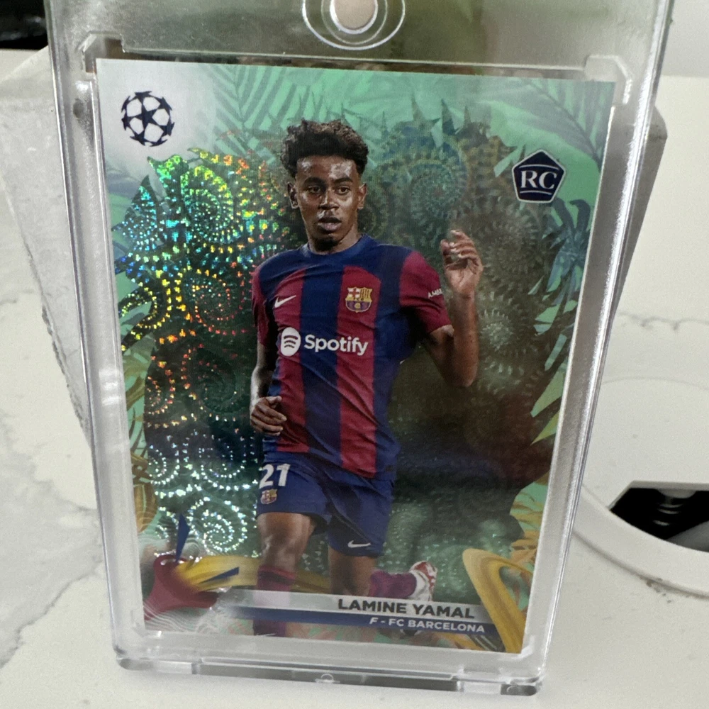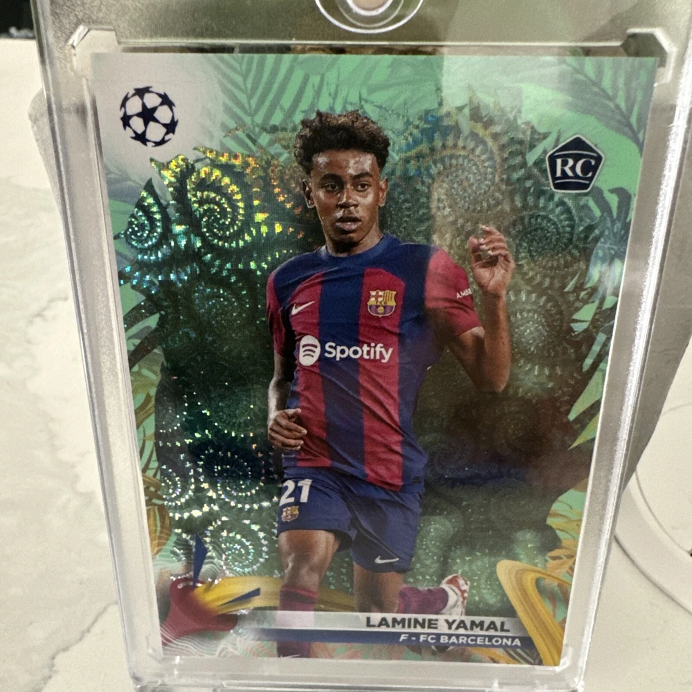 Up for sale is the 2023-24 Topps Carnaval UEFA Lamine Yamal #78 Rookie RC Green trading card, limited to 09/75. This sports trading card features the talented soccer player in his rookie season, making it a valuable addition to any collection. Get your hands on this rare card from the 2023-24 set and showcase your support for Lamine Yamal as he makes his mark in the world of soccer trading cards.