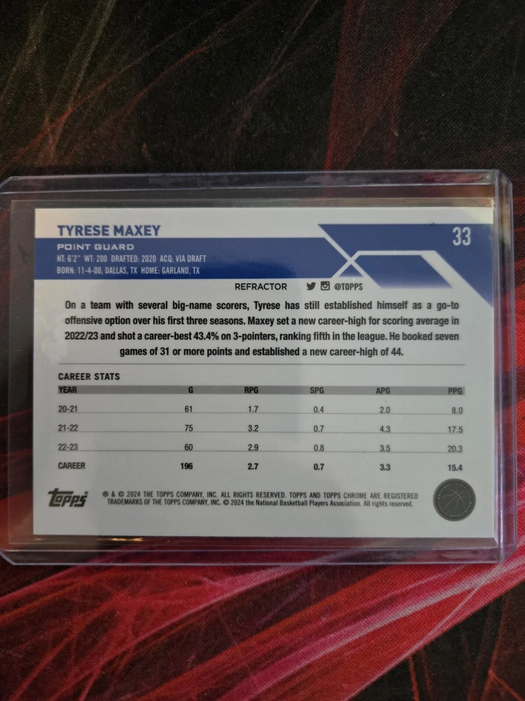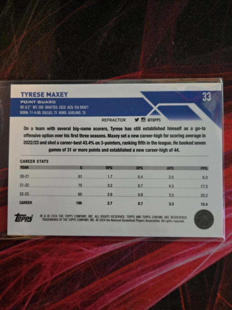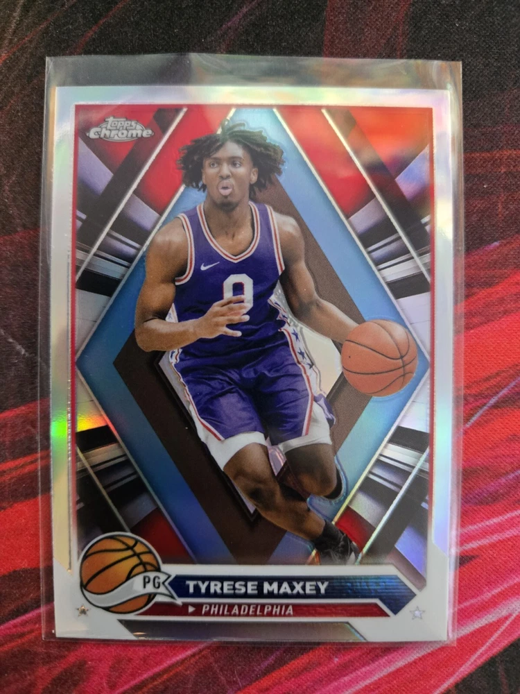 This 2023-24 Topps Chrome sports trading card features Tyrese Maxey of the Philadelphia 76ers. The card is a standard size and made of card stock material, with a chrome finish and refractor design. It is an original and licensed reprint, part of the base set and with a card number of 33. The card is perfect for collectors and fans of the National Basketball Association (NBA), with features like the player's name, team logo, and card number. It is a great addition to any collection and commemorates the NBA Finals event/tournament. The card is manufactured in the United States by Topps and is available in English language.