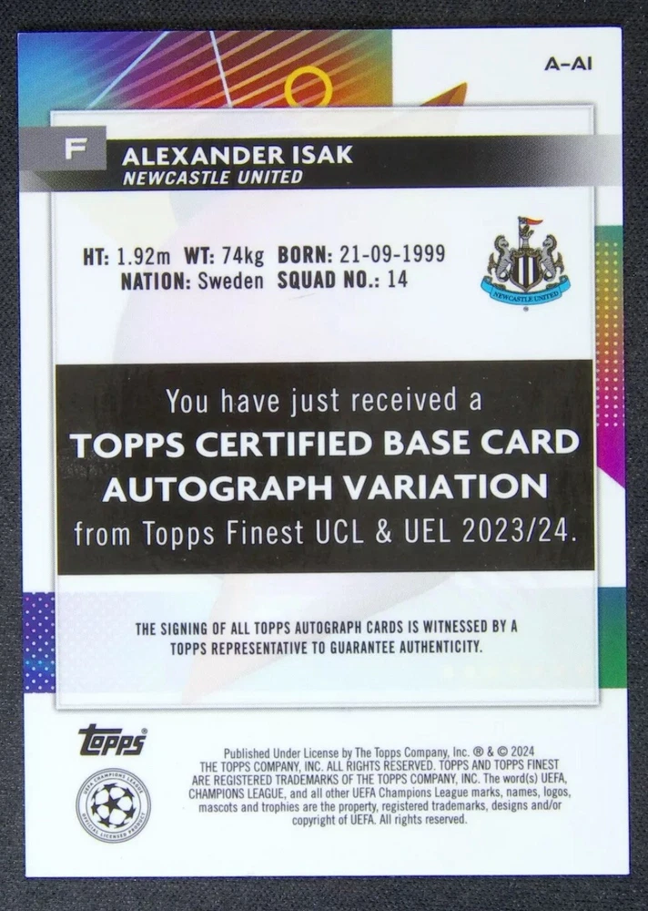 2023-24 Topps Finest Alexander Isak #A-AI Auto Blue Refractor /150 is a rare sports trading card featuring the talented soccer player from the 2023-24 season. This card is part of the sought-after Topps Finest set and comes in a stunning Blue Refractor parallel/variety. Limited to only 150 copies, this card is a must-have for any collector or fan of Alexander Isak. Add this unique piece to your collection and showcase your love for the sport of soccer.⚽️