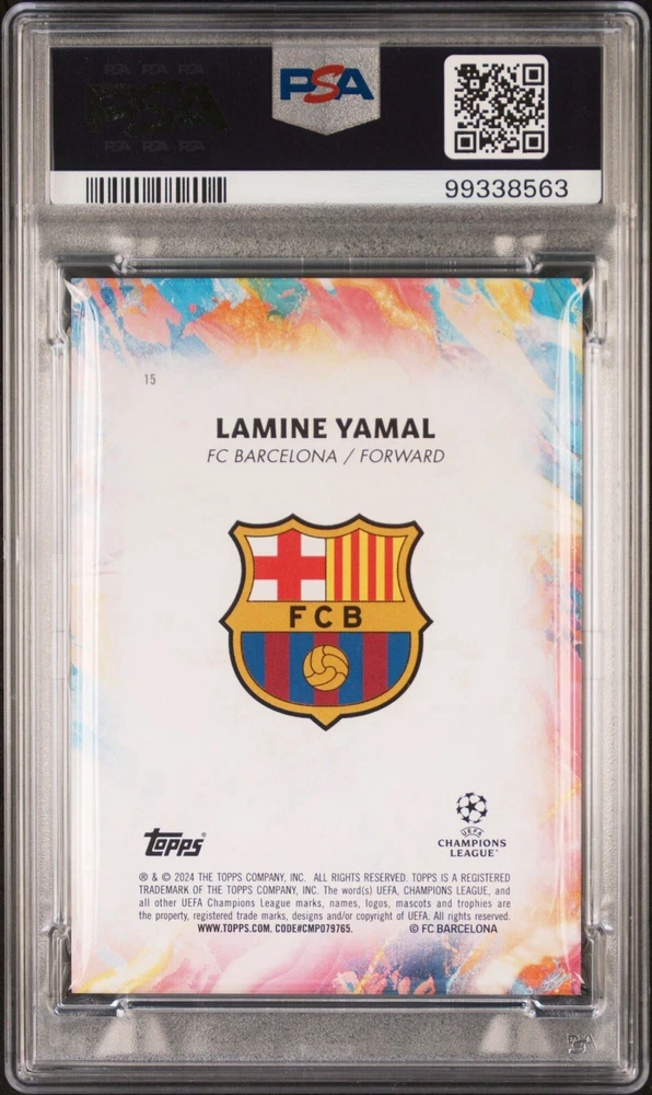 This 2023-24 Topps Inception UCC #15 trading card features Lamine Yamal of FC Barcelona and Spain. The card is part of the Topps Inception - Succession set and is an original, not a licensed reprint. It is a rainbow foil parallel variety with a print run of 150 and has been graded a perfect PSA 10. The card is in standard size and was manufactured by Topps in 2024. It is a sports trading card for soccer fans and collectors, featuring players like Endrick, Diego Maradona, Ethan Nwaneri, Cristiano Ronaldo, and Lionel Messi. The card is also serial numbered and comes with a base set and rookie features. It is a great addition to any collection and perfect for fans of FC Barcelona and Spain.