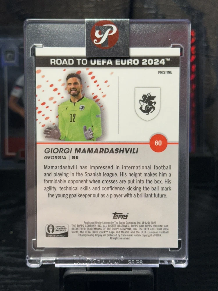 Manufacturer:ToppsLeague:UEFA European ChampionshipsTeam:GeorgiaFeatures:Chase, Parallel/Variety, Serial Numbered, Short PrintOriginal/Licensed Reprint:OriginalCard Size:StandardAutographed:NoMaterial:Card StockParallel/Variety:Blue RefractorYear Manufactured:2024Season:2023-24Player/Athlete:Giorgi MamardashviliSet:2023 Topps Pristine Road to UEFA Euro 2024Card Name:Pristine RefractorPrint Run:75Type:Sports Trading CardLanguage:EnglishVintage:NoSport:SoccerCard Number:60