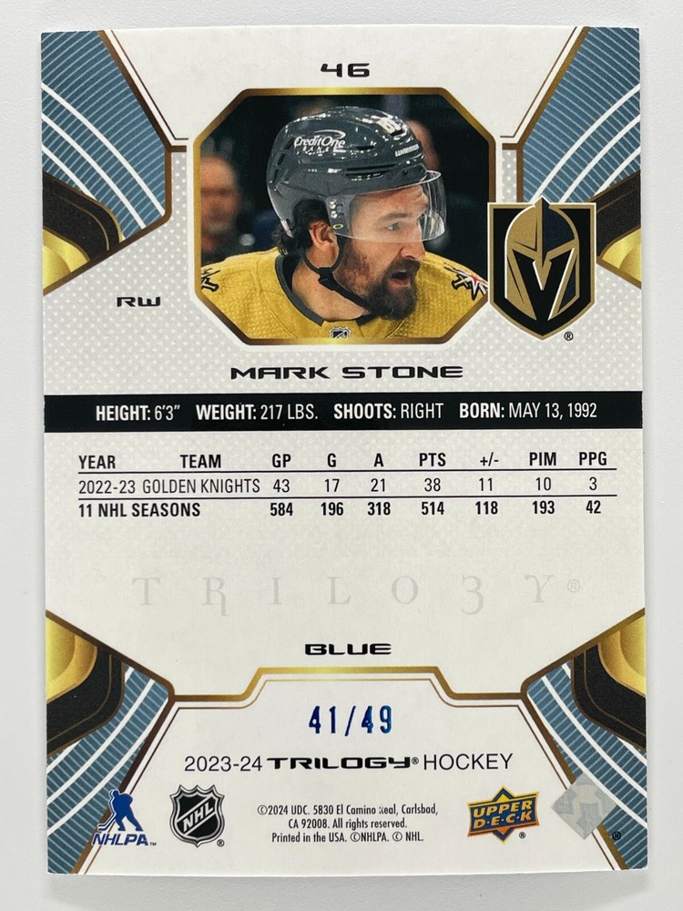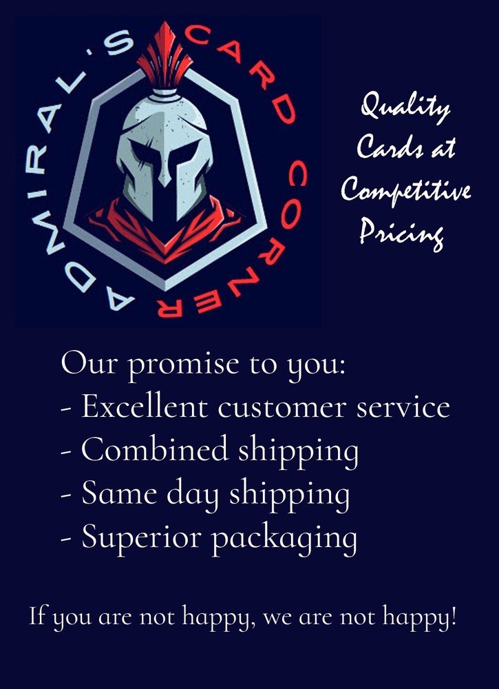 2023-24 Upper Deck Trilogy Blue Mark Stone #27 41/49 All cards are stored and shipped in card sleeves and top loaders unless specified otherwise. Please note: Payment is required within 7 days otherwise automatic cancellation will occur. Please check out our other listings for more great cards and bundle your purchases to optimize the shipping. Be sure to follow Admiral’s Card Corner and browse often to see new listings. Canadian Orders: All purchases over the value of $20.00 will ship with tracking to ensure secure delivery. All purchases under $20.00 will ship Canada Post Oversized Letter mail ($4.50). Shipments over $20.00, up to a weight of 200g, will ship Canada Post Expedited Lite ($12.00); tracking is automatically included by Canada Post to ensure secure delivery. Shipments over 200g will be shipped via Canada Post Parcel; prices may vary depending on location. Please request a quote from Admirals Card Corner for accurate shipping costs. International shipments: Shipments to the USA (2Kg and under) will be shipped via Canada Post Tracked Packet USA ($9.50); tracking is provided by Canada Post with this option. Currently the cheapest option for US shipments. Overseas shipments are available upon request. Please request a quote from Admirals Card Corner for accurate shipping costs. Note: The buyer is responsible for applicable duty / taxes required by the destination customs services upon receipt of the item. What you need to know when interpreting listed card condition when purchasing raw cards. eBay's card conditions for Near mint or better equates to anything from a PSA 7 - PSA 10. Please note that a Near mint or better listed condition does not mean that the card will grade a PSA 10 . Excellent condition equates to a PSA 5 - PSA 6. A summary of the PSA grading scale is shown below. GEM-MT 10: GEM MINT A PSA Gem Mint 10 card is a virtually perfect card. Attributes include four perfectly sharp corners, sharp focus and full original gloss. A PSA Gem Mint 10 card must be free of staining of any kind, but an allowance may be made for a slight printing imperfection, if it does not impair the overall appeal of the card. The image must be centered on the card within a tolerance not to exceed approximately 55/45 to 60/40 percent on the front, and 75/25 percent on the reverse. MINT 9: MINT A PSA Mint 9 is a superb condition card that exhibits only one of the following minor flaws: a very slight wax stain on reverse, a minor printing imperfection or slightly off-white borders. Centering must be approximately 60/40 to 65/35 or better on the front and 90/10 or better on the reverse. NM-MT 8: NEAR MINT-MINT A PSA NM-MT 8 is a super high-end card that appears Mint 9 at first glance, but upon closer inspection, the card can exhibit the following: a very slight wax stain on reverse, slightest fraying at one or two corners, a minor printing imperfection, and/or slightly off-white borders. Centering must be approximately 65/35 to 70/30 or better on the front and 90/10 or better on the reverse. NM 7: NEAR MINT A PSA NM 7 is a card with just a slight surface wear visible upon close inspection. There may be slight fraying on some corners. Picture focus may be slightly out-of-register. A minor printing blemish is acceptable. Slight wax staining is acceptable on the back of the card only. Most of the original gloss is retained. Centering must be approximately 70/30 to 75/25 or better on the front and 90/10 or better on the back. EX-MT 6: EXCELLENT-MINT A PSA EX-MT 6 card may have visible surface wear or a printing defect which does not detract from its overall appeal. A very light scratch may be detected only upon close inspection. Corners may have slightly graduated fraying. Picture focus may be slightly out-of-register. Card may show some loss of original gloss, may have minor wax stain on reverse, may exhibit very slight notching on edges and may also show some off-whiteness on borders. Centering must be 80/20 or better on the front and 90/10 or better on the reverse. EX 5: EXCELLENT On PSA EX-5 cards, very minor rounding of the corners is becoming evident. Surface wear or printing defects are more visible. There may be minor chipping on edges. Loss of original gloss will be more apparent. Focus of picture may be slightly out-of-register. Several light scratches may be visible upon close inspection, but do not detract from the appeal of the card. Card may show some off-whiteness of borders. Centering must be 85/15 or better on the front and 90/10 or better on the back