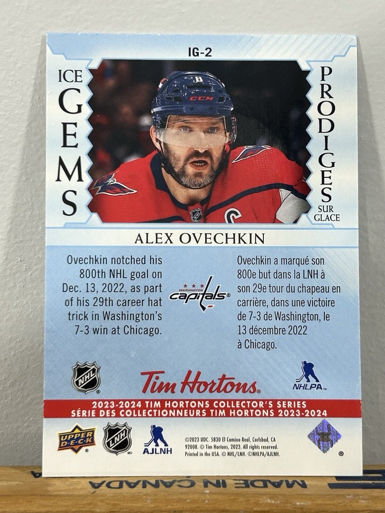 2023-24 UPPER DECK TIM HORTONS IG-2 ICE GEMS ALEX OVECHKIN - RARE Combine shipping is $0.50/per card or $1.00/per lot Shipping to Canada is $3.00 and to United States is $10.00 (shipped in bubble mailer) Combine shipping orders OVER $75 will be shipped tracked and insured at a cost of $15 in Canada and $20 in the USA PLEASE NOTE: Some cards shipped may take longer to arrive then expected given delays in Canada Post and United States Postal Services. Please be patient. Could be 2wks to a month in some areas so please take this into consideration when bidding as I do not guarantee the estimated arrival times provided through the shipping options on ebay so please be patient