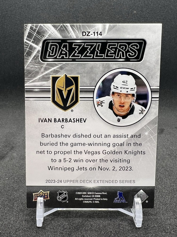 This 2023-24 Upper Deck Extended Series Dazzlers Green card features Ivan Barbashev of the Vegas Golden Knights in the National Hockey League (NHL). The card is part of the 2023-24 Upper Deck set and has a card number of DZ 114. This sports trading card is an insert with a green parallel/variety and is near mint or better conditioned. It is ungraded and has not been autographed. The card is perfect for collectors of ice hockey memorabilia and is a must-have for fans of the Vegas Golden Knights.