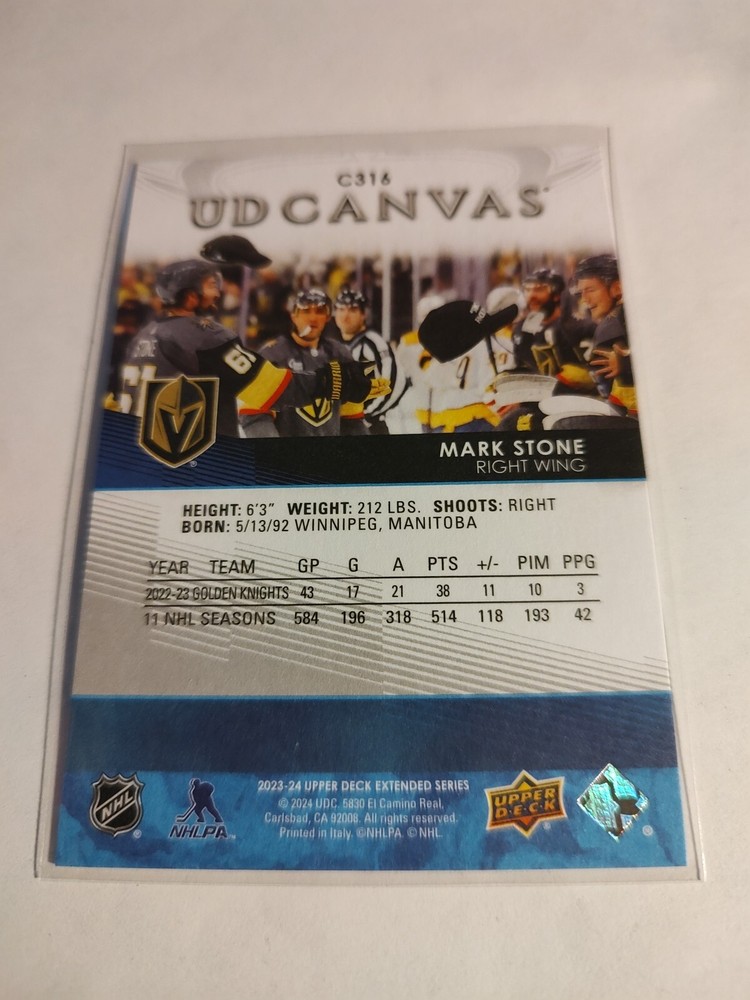 Elevate your sports trading card collection with the 2023-24 Upper Deck Extended Series - UD Canvas #C316 featuring the talented Mark Stone of the Vegas Golden Knights. This exclusive insert from the renowned Upper Deck manufacturer showcases the athlete's skill and presence on the ice, capturing the essence of the game in a single, striking design. As a treasured piece of Ice Hockey memorabilia, this card is a must-have for fans and collectors alike. It represents a snapshot of the 2023-24 NHL season, spotlighting the craftsmanship of Upper Deck and the athletic prowess of Mark Stone. Perfect for display or as a key addition to any collection, this trading card is a celebration of the sport and its stars.