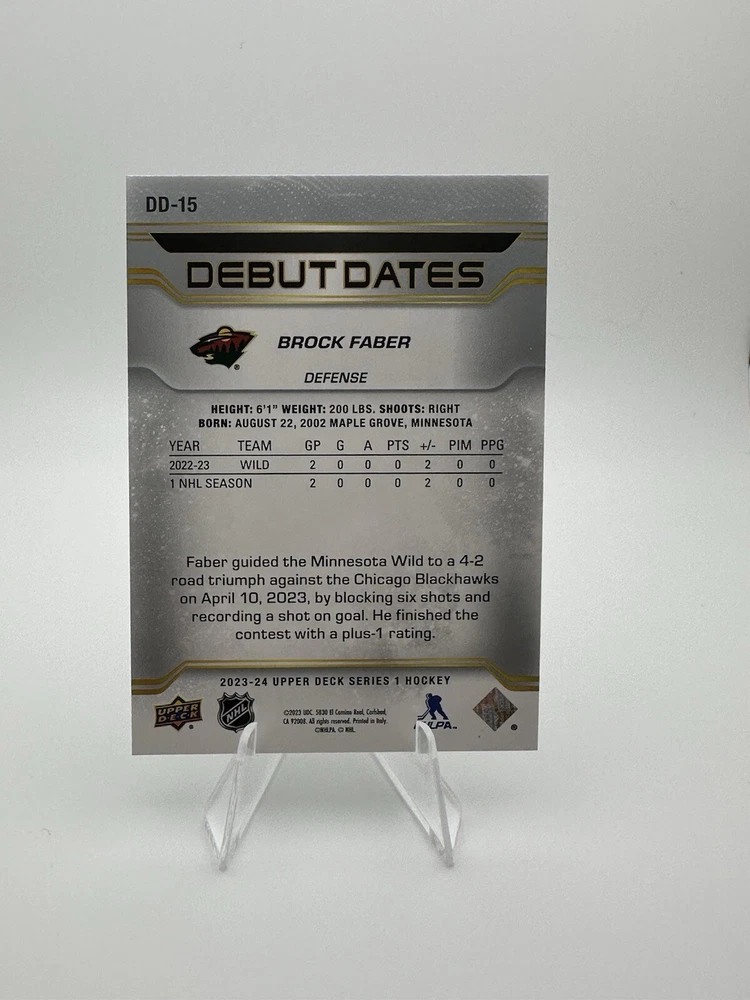 2023-24 Upper Deck Series 1 Brock Faber Rookie Debut Dates RC #DD-15 MN Wild