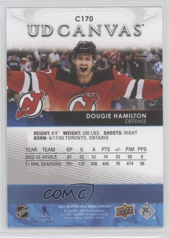 2023-24 Upper Deck Series 2 - UD Canvas #C170 Dougie Hamilton - Ice Hockey Card - Featuring the New Jersey Devils - Featuring Dougie Hamilton Search for more: 2023-24 Upper Deck Series 2 Search for more: 2023-24 Upper Deck Series 2 - UD Canvas View all of our Listings Auctions Buy It Now About Us Located in the beautiful Pacific Northwest, COMC (Check Out My Cards) is the world's largest consignment service for trading card singles. More than 10,000 people have used our consignment service to list over 50 million trading cards. Find out how we can help you consign your items on eBay by contacting us through eBay messaging. COMC -- "The Safe & Easy Way to Buy & Sell" Representative Image - Select Specific Item above to see image of actual item Representative Image - Select Specific Item above to see image of actual item Raw Condition for Modern Cards Unless otherwise noted, raw modern cards are listed in Near Mint-Mint condition or better. A NM-MT card appears to be Mint at first glance, but upon closer inspection, may exhibit some of the following: minor print defects (e.g. roller marks, print line, dimple), minor scratches, slight edge wear, and slight corner wear. Centering is clearly visible in the images provided and does not factor into our condition assessment. Raw Condition for Vintage Cards Unless otherwise noted, raw vintage cards are listed in Excellent condition or better. An EX card may exhibit some of the following: minor rounding of corners, surface wear, print defects, light scratches, and slight edge wear/chipping. Centering is clearly visible in the images provided and does not factor into our condition assessment. Domestic Shipping Combined shipping for multiple items is available. To receive combined shipping, please ensure all desired items are in your eBay shopping cart before proceeding to checkout. eBay limits orders to 40 items per order. We automatically combine multiple orders placed on the same day. If you place multiple orders on the same day, please contact us to request a refund of applicable shipping costs. Signature confirmation may be required on invoices over $400. All cards are protected and shipped securely. International Shipping COMC offers eBay's International Shipping (EIS) for international orders under $2,500* (see country exceptions below). All duties and import fees are paid at checkout; in the rare event that there are additional import fees upon delivery, these are borne by the buyer. EIS packages route through a shipping hub in Erlanger, KY before shipping to their final destination. Please note that EIS does not allow for combined shipments. The shipping rates are determined by eBay and cannot be adjusted. *Maximum sale price exceptions: Colombia, Kuwait ($2,000); Taiwan ($1,539); Chile, Costa Rica, Guatemala, Honduras, Trinidad and Tobago ($1,000); Antigua and Barbuda, Aruba, Belize, Dominica, Grenada, Philippines, Saint Kitts and Nevis, Saint Lucia, Montserrat, Turks and Caicos Islands ($500); Dominican Republic, El Salvador ($200). Please request a shipping quote through eBay messaging for orders that exceed the maximum sale price supported by eBay's International Shipping. You will be responsible for all duties and import fees for international orders shipped outside the EIS. All cards are protected and shipped securely. Payment COMC does not accept offers on our cards through our eBay storefront. COMC utilizes eBay’s managed payments system. If you are experiencing difficulties making a payment, please contact eBay for assistance. Return Policy Returns are only accepted on the rare occasion the item is not as described. If you are making a return, please initiate the return process through eBay so a mailing label can be provided for you. Prior to listing, our expert team carefully assessed this item to represent it accurately. Please review the description and high-definition images prior to purchasing to ensure this item meets your satisfaction. We welcome you to contact us if you have further questions about this item. Trust and Integrity COMC carefully assesses each item consigned to us to prevent fraudulent items from entering the marketplace. If you believe an item offered on COMC may be fraudulent, please contact us with details so we can investigate the issue. Items we determine are outside our supported items policy may be removed. Last Modified: 7/1/2025 1:51:45 PM PDT