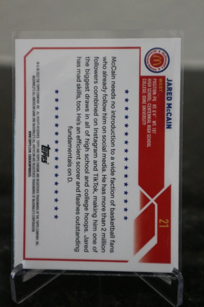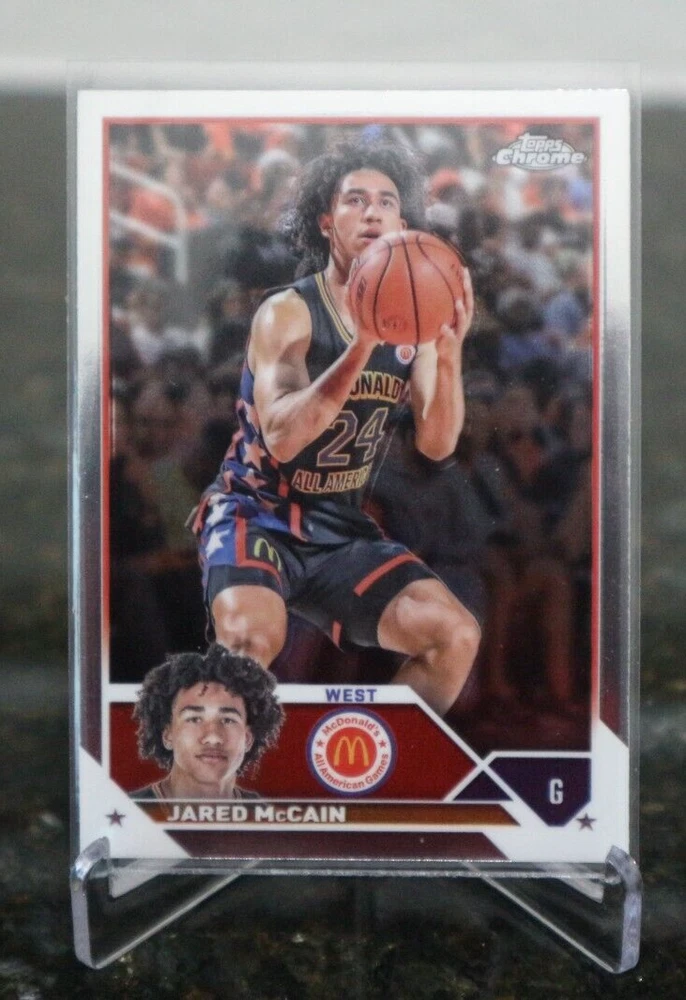 Elevate your basketball card collection with the 2023 Topps Chrome McDonald's All-American card featuring standout player Jared McCain. As card number 21 in the set, it captures the essence of the season's excitement and showcases the athlete's promising career.This card, produced by renowned manufacturer Topps, is a must-have for enthusiasts and collectors alike. Its sleek chrome design coupled with the iconic McDonald's sponsorship emblem makes it a unique piece of sports memorabilia that commemorates McCain's achievements on the court.