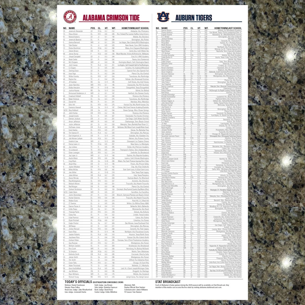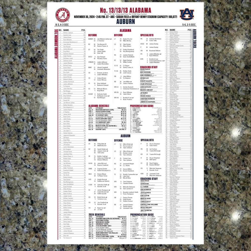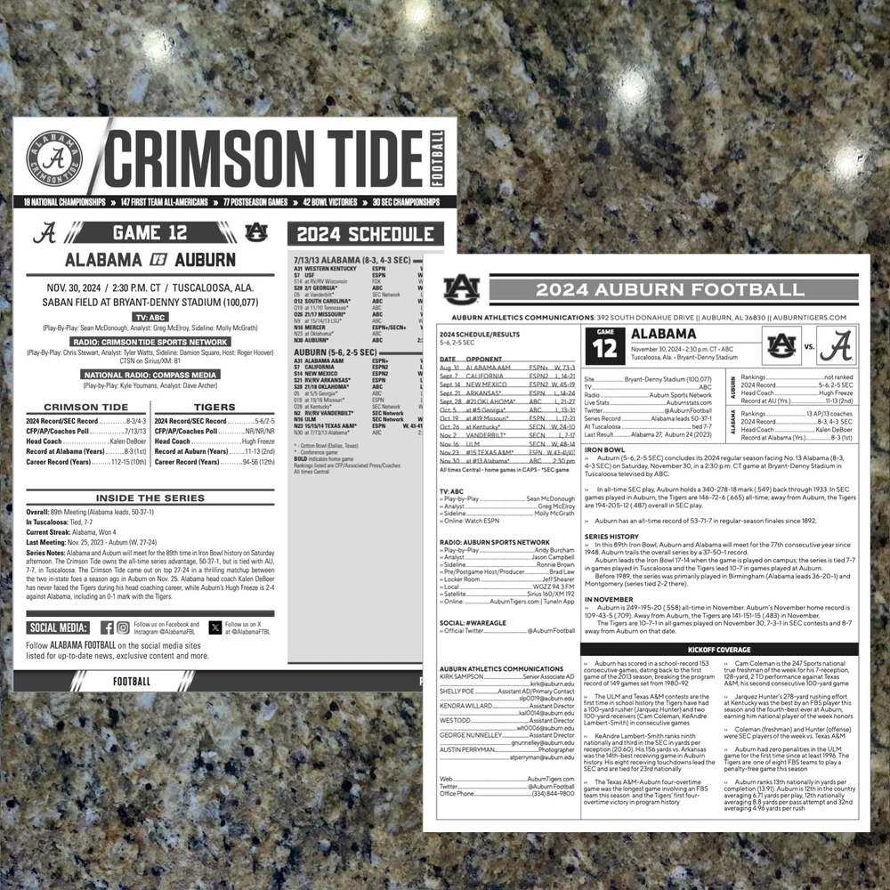 For sale, the game issued Flipcard and Media Program Notes from the legendary rivalry game Auburn vs Alabama. Saturday, November 30, 2024. What you get: 1. 11x17 Game Issued Media Issued Flipcard - Auburn vs Alabama 2. Alabama Media Program Game Note (1-page) 3. Auburn Media Program Game Note (1-page) 4. Plastic protector sheet