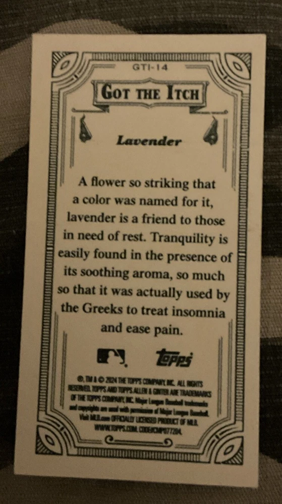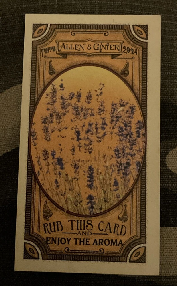 The 2024 Allen & Ginter Got The Itch Lavender GTI-14 Mini Scratch N Sniff Aroma trading card is a unique collectible featuring the Miami Marlins baseball team. Produced by Bowman, this original sports trading card is a mini variety with a special scratch and sniff feature that releases a lavender aroma when scratched. The card is part of the 2024 season series and is not professionally graded. This rare and innovative card offers a fun sensory experience for collectors and fans of the Miami Marlins.