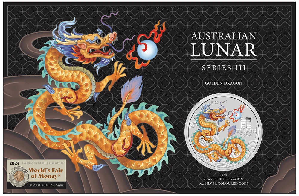 FREE SHIPPING ON DOMESTIC ORDERS New releases Deals Exclusives Bullion Gold Graded Licensed Standing behind our products & our name for over a century SINCE 1915 SHOP BY CATEGORY Animal Theme Art Coins Coin Sets Comics, Notes, & Foils Deals Famous Figures & Landmarks Gold Coins GR Reserve Exclusives Graded Coins Holiday Theme Licensed Products Lunar Calendar Nature Coins Premium Bullion Rare Certificate Numbers Shaped Coins Warriors & Gods Other PARTNERS & AFFILIATIONS STORE NEWSLETTER Add us to your Favorites and receive exclusive emails about new items and special promotions! Sign up 2024 Australia ANA Lunar Golden Dragon 1oz Silver Colorized Coin in Card Product Description The dragon commands the highest respect in Chinese culture. For thousands of years, it was associated with the emperor and his descendants, symbolising wisdom, enlightenment, and benevolence. The dragon is also one of the 12 animals featured in the ancient lunar calendar. Those born under the sign of the lunar dragon in 2024, 2012, 2000, 1988, 1976, and every 12th preceding year, are said to be ambitious, successful, and charismatic. Struck by The Perth Mint from 1oz of 99.99% pure silver, each coin is issued as legal tender under the Australian Currency Act 1965. The Perth Mint will release no more than 5,000 of the Australian Lunar Series III Golden Dragon 2024 Year of the Dragon 1oz Silver Coloured Coin in Card in individual packaging from a maximum mintage of 200,000. The coin’s reverse portrays a Golden coloured Chinese dragon and a flaming pearl, a symbol of wisdom. Included in the design is the Chinese character for ‘dragon’, the inscription ’DRAGON 2024’ and a ‘P125’ mintmark signifying the Perth Mint’s 125th anniversary. The coin bears the Jody Clark Memorial Obverse of Her Majesty Queen Elizabeth II supplemented with the dates of her reign ‘1952-2022’, as well as the weight and fineness, and the monetary denomination. The coin is presented in a stylised presentation card which features a fold-out stand for upright display. • 99.99% pure silver • Coloured Year of the Dragon design • Australian legal tender • Limited issue – 5,000 • Beautifully illustrated presentation card Contact Shipping Payment Returns To contact our Customer Service Team, simply click the button here and our Customer Service team will be happy to assist. Domestic Shipping Options - Free shipping USPS Ground Advantage UPS Ground Saver International Shipping Options – Calculated USPS Priority Mail International UPS Worldwide Expedited UPS Worldwide Saver UPS Standard to Canada Handling time Will ship within 1 business day of receiving cleared payment. Ship From Location Attleboro, Massachusetts, 02703, United States Note to international buyers The item price and shipping charges do not include import duties, import taxes, and customs clearance fees. These charges are the buyer's responsibility. Please check with your local customs office to determine what these additional charges may be prior to bidding or purchasing an item. If your order is returned to GR Reserve due to your refusal to pay duties or taxes, or if the carrier (for example, Federal Express or UPS) was unable to deliver your order, you agree you are responsible for any return shipping fees, additional duties, or applicable taxes for returning the package back to GR Reserve. In addition, if your package is returned to GR Reserve, we will not reship your order unless and until we are paid in full for any return shipping costs, duties, taxes we have had to pay or advance for you as well as any subsequent re-ship fees back to you. Immediate payment is required upon selecting "Buy It Now" or upon checking out through the cart. We accept payment via U.S. PayPal accounts and all Major Credit Cards, Debit Cards & Google Pay. We are legally required to collect sales tax in those states and localities where we maintain a physical presence. The applicable amount of sales tax charged to an order will be calculated based on the shipment destination's state and local sales tax laws. Thank you for shopping with us on eBay! Standard Other eBay Mastercard® Earn up to 5x points when you use your eBay Mastercard®. Learn more GR Reserve’s return, refund, and exchange policy is limited to (30) business days from the date that you received your item. If you find you have received a defective item, please contact us, and include detailed photos. GR Reserve will then assess whether the product is eligible for a return, refund, or exchange. For approved exchanges, you must follow all instructions provided by us, including packaging the product appropriately. We are responsible for the cost of return domestic shipping and the risk of loss during the return shipment. Refer to eBay Return policy for more details. You are covered by the eBay Money Back Guarantee if you receive an item that is not as described in the listing. Free Shipping On all domestic order 100% SATISFACTION GUARANTEED About Feedback GR Reserve - Attleboro, MA 02703
