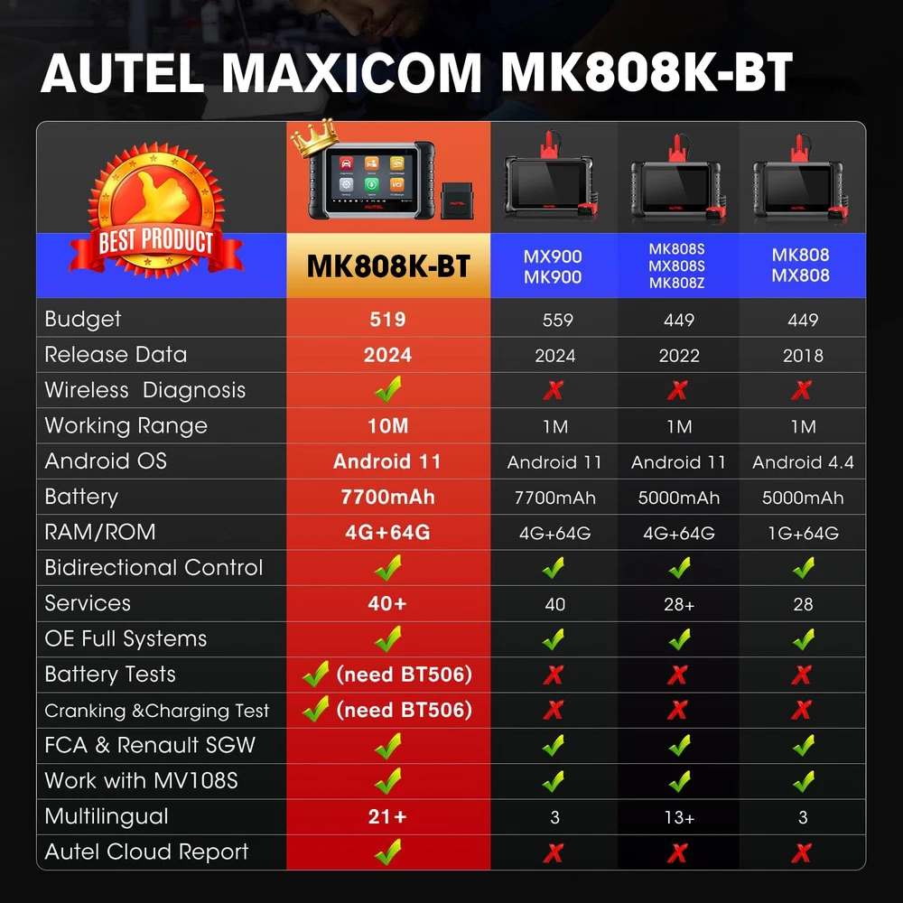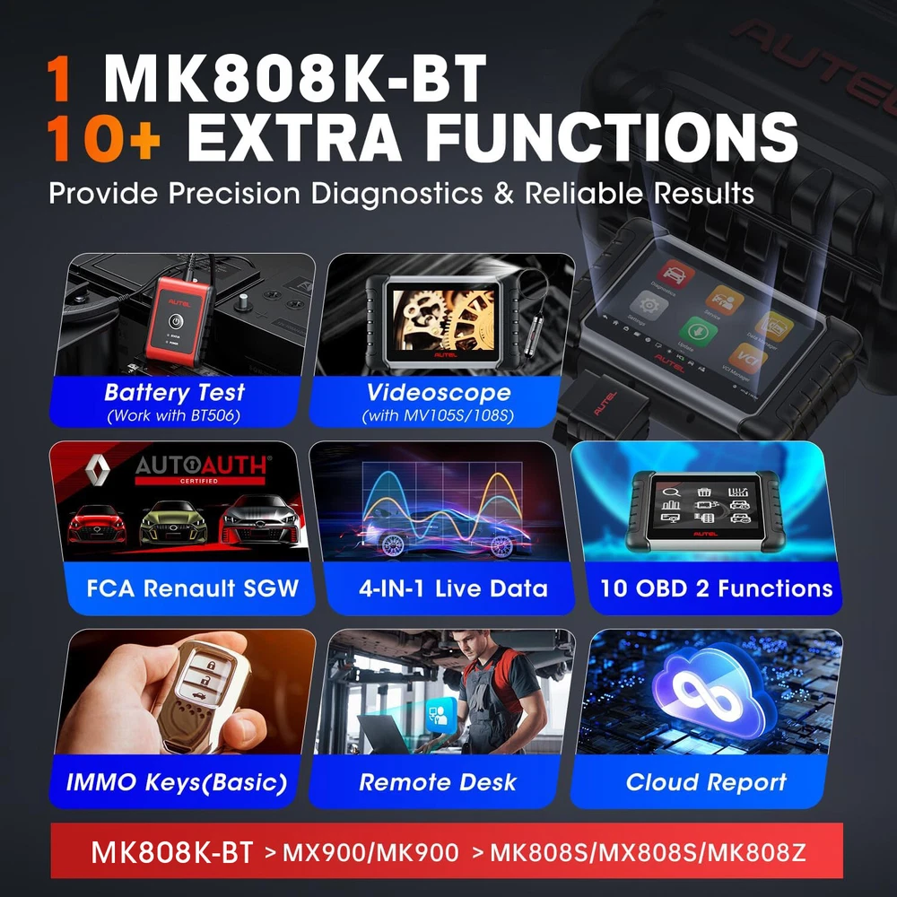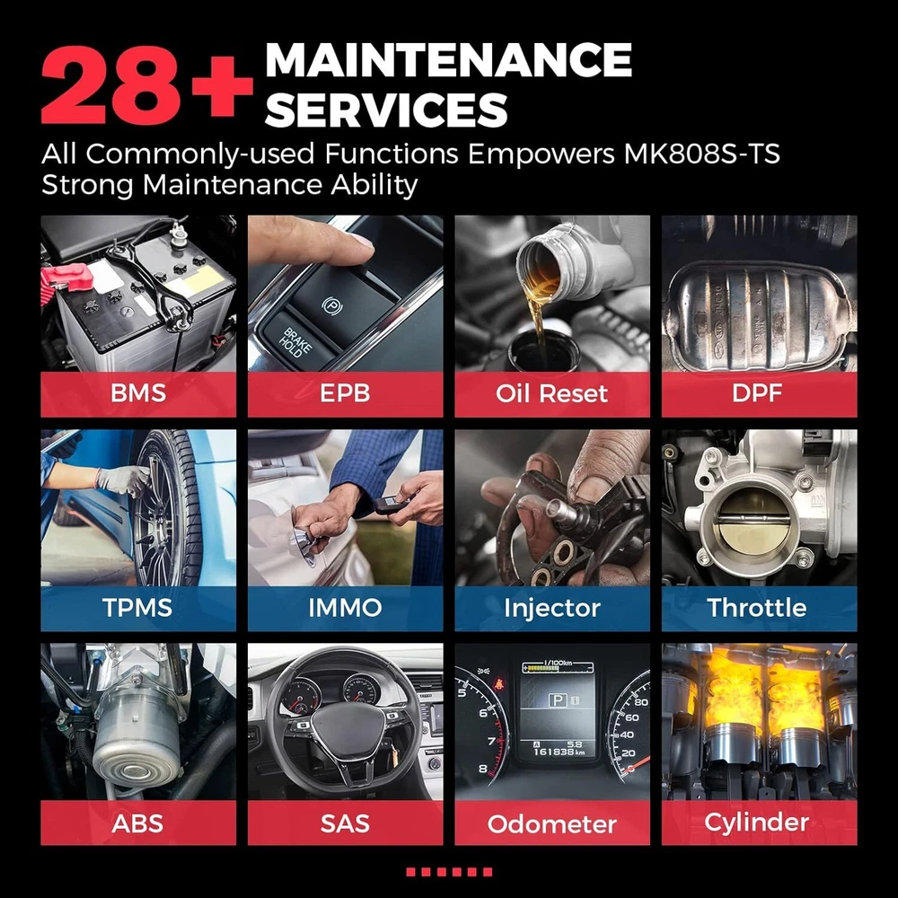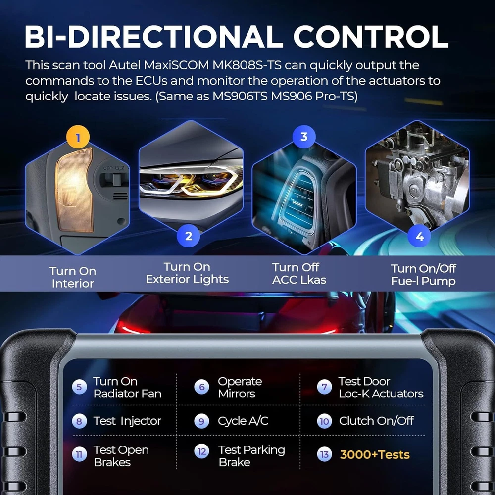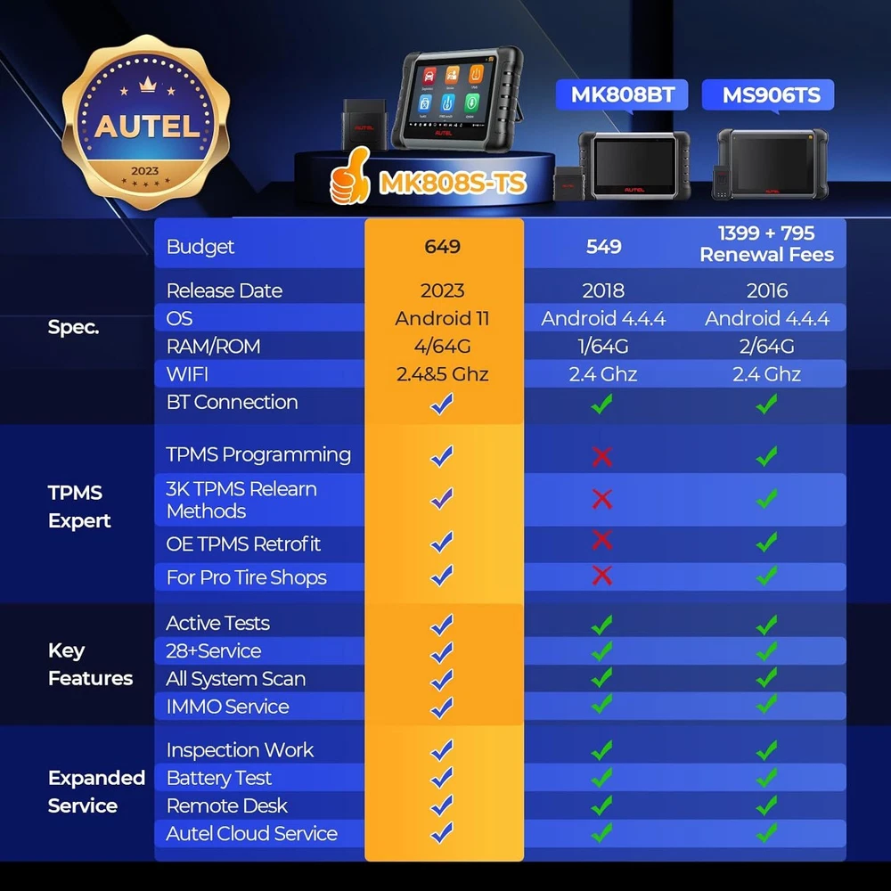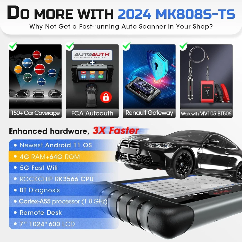 2024 Autel MaxiCOM MK808S-TS Bidirectional & TPMS Programming Diagnostic Scanner Autel MaxiCOM MK808S-TS OBD2 Scanner: 2024 Updated of MK808BT PRO, MK808TS MX808TS TS601 with Bidirectional Test, 28 Service 150 Makes, TPMS Programming Relearn Retrofit, All-System Scan, OS 11 4+64G ✅ Note: This listing has 4 Options which include different items, please make sure the options and items you want to have before order it. Thanks. 💥 Note:Multiple package options,pls choose what you want! Package option 1 : MK808S ($467) Package option 2 : MK808K-BT ($529) Package option 3 : MK808S-TS ($590) Package option 4 : MV105S($45.99) About this item 🎉【 Equals MK808BT PRO +TS608 】Upgraded from MaxiCheck MX808S-TS MK808TS MK808BT PRO, 2024 New Version MaxiCOM MK808S-TS obd2 scanner has highly upgraded its hardware and car coverage at the same cost to offer you smoother diagnostic experience. With powerful ROCKCHIP RK3566 CPU, improved OS Android 11, larger 4GB+64GB, 5G Wi-Fi, fast-running MK808S-TS is equipped with advanced TPMS Function, 28 Service, Active Test, All System Diagnosis for 150 brands to meet all your daily repairing needs. 【 Complete TPMS Diagnosis Plus TPMS Retrofitting 】As the great combo of Maxitpms TS601/TS608/MK808BT PRO, TPMS programming & relearn tool MK808S-TS can perform every aspect of TPMS service: all-known sensors activation; view sensors data, TPMS diagnostics; 4 ways to program Autel MX-Sensor; 3 positions relearn procedures; TPMS retrofit, which can help vehicles without factory-fitted TPMS module or sensors build everything from scratch, allowing you to enjoy worry-free driving. 【 Ground-Breaking Bi-directional Control Scanner 】2024 NEW RELEASE MK808S-TS diagnostic scan tool for all vehicles enjoys the powerful Active Testes, which makes MK808S-TS the most cost-effective bidirectional mechanic tool (Cost less $594 than MP808BT PRO+TS601). Bi-directional Control is widely used on car subsystems to help you check if the car actuators are all in good condition. Such as windows, rear mirrors, sunroof, wipers... 【 28+ Maintenance Service for 150 Brands 】Complete functions & competitive price make the MK808BT enhanced version MK808S-TS stands out in all code readers & scan tools. Updated of MZ808, MX808S-TS, MK808S-TS BT & Wireless auto scan tool has gathered more special functions which are available on wider car coverage from 1996 to 2024. In total over 28+ special functions are the perfect solutions for the daily tune-ups, such as oil reset, EPB, TPMS, BMS, brake bleeding, IMMO, SAS etc. 【 Factory-Level All System Diagnostics 】To root out car problems hidden underneath the hood, Autel scanner MK808S-TS features OE-level full-system diagnostics just as Snap-on scanners but covers more vehicles. MK808TS escaner para auto can dive into every corner of the systems, such as TCM, ECM, EPS, PDM, BCM, etc. to do Read/Clear Codes, ECU info., Live Data, Active Tests, & Special Functions. Also, it presents everything about your ride with a specific report. 【 150+Brands Coverage & Updated Functions】 Bidirectional scanner MK808STS has been further developed with 150+brands coverage & more functions. Its complete TPMS functions & all-system diagnoses all work very well on 150+ car brands (1996-2024). The AutoAuth allows you to diagnose FCA cars after 2018 without a bypass cable. The Renault SGW function unl-ocks Renault’s gateway to perform diagnoses & services. The extended features capture every detail with MV105 & BT506. 【 0-Risk Purchase with Reliable Seller】 As the updated version of MK808BT PRO, MX808S-TS MK808Z-TS, our MK808S-TS works very well on 99% cars with enhanced hardware and more powerful software. As the largest Autel officially certified seller for 8 years, we offers you 1-year warranty & free updates, 24/7 thoughtful support and 30-day refund & exchanges. Product Description 2024 AUTEL MAXICOM MK808S-TS with ENHANCED HARDWARE and SOFTWARE 2024 Autel Newest OE-Level Bidirectional & TPMS Tablet---MaxiCOM MK808S Q: Plz Recommend a Cost-Effective Scanner to Both Professional Mechanics and Tire Shops. A: As the PM of Autel, I would highly recommend MK808S-TS to you. With only 659BUCKS, you can get this amazing device---the combination of MK808S+MK808BT+TS601, featuring both the high-end diagnostic functions and TPMS professional functions together. Q: Why Upgraded the MK808TS to the MK808S-TS? A: For the benefit of consumers, we upgraded the MX808TS & MK808TS to MK808S-TS at the same cost, but added more features & car models. 1. Fully Enhanced Hardware: the more powerful CPU ROCKCHIP RK3566, the improved OS Android 11, the larger 4GB+64GB, the faster & more stable 5G Wi-Fi, etc. 2. Wider Vehicle Compatibility; 3. More Features & Faster Software Updating, allowing you to diagnose more new cars on the market earlier than other mechanics. Q: What the 2024 Enhanced Version MK808S-TS Can Do? Newly-Added Bi-Directional Control: More cost-effective than MK808BT+TS608 AutoAuth for 2017 & later FCA cars: for Chrysler, J-e-e-p, Dodge, Fiat, etc. Renault Security Gateway Function: unl~ocking Renault’s gateway to perform diagnoses, services, etc. 28+ Special Functions: Work with 150 car makes from 1996 to 2024 Complete TPMS Functions: 4 ways to program, 3 options to relearn, thousands of TPMS relearn procedures, 99% all brand sensor activating, accurate sensor data reading and advanced TPMS Retrofit function for professional tire shops OE-Level Full-System Diagnosis : Same as Snap-on scanner, enter every corner of on-board systems Wireless BT MaxiVCI Diagnostics: Equipped with MaxiVCI, offering strong single, helping you out from entangled cables Multiple User-Oriented Features: Convenient Auto VIN Scan, Shop Manager, Data Manager, Remote Desk, etc. 2024 AUTEL MAXICOM MK808S-TS with ENHANCED HARDWARE and SOFTWARE 2024 Newly Added Bi-Directional Control---3X Faster Locate Car Issues without Extra Cost Updated of OBD II scanner MaxiCOM MK808BT and Maxi