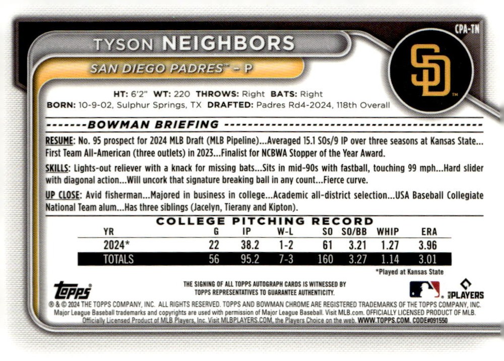 *** Checklists listed in GOOD condition most likely are marked, all other conditions will at least be unmarked. 2024 Bowman Chrome Draft Autographs Blue Refractors #CPATN Tyson Neighbors /150 Front Back Sport: Baseball Set: 2024 Bowman Chrome Draft Autographs Blue Refractors Year: 2024 Item#: CPATN Player: Tyson Neighbors Team: San Diego Padres Attributes: Autograph, Serial Numbered Brand: Bowman Chrome Draft Manufacturer: Topps Co. Grading Company: Raw Grade SetType: Parallel Insert Item Condition: Near Mint/Mint 2014 Beckett Collectibles, LLC. All Rights Reserved Powered by: Please place your order and I will send you an updated invoice with the combined shipping for your purchase. First Class $3.95 no matter how many single cards or team sets, shipped in the USA , ( PLEASE WAIT TO RECEIVE A COMBINE INVOICE BEFORE PAYING) $5.50 for Priority, and FREE SHIPPPING For all orders of $35 or more for single cards within the USA ............ Most orders ship within 24 hours or receipt of payment... To save on shipping, please check out the items currently available in my eBay store. FOR SINGLE CARDS and TEAM SETS ONLY ::: Shipping in the USA is a flat $3.95 for USPS First Class no matter how many single cards, or $8.95 for USPS Priority no matter how many cards in the order. INTERNATIONAL SHIPPING WILL BE CALCULATED DUE TO QUANTITIES AND LOCATION FOR DELIVERY !!! FREE SHIPPING is given for All Orders of $35 or more for single cards only, shipped in the USA only. This does not apply for international shipping. Sets and other various non single card items will either have separate shipping specified or please contact me for specific charges. Thank you, Stephen