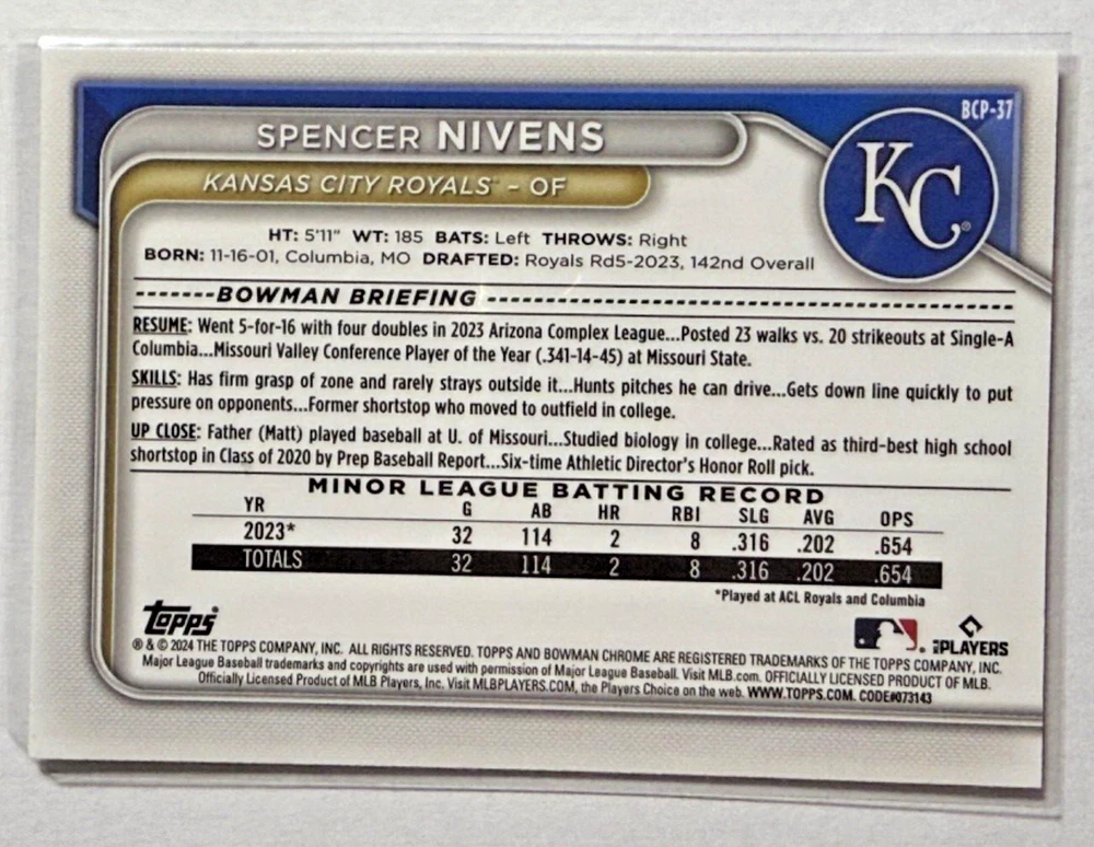 The 2024 Bowman Chrome MINI DIAMOND REFRACTOR trading card features Spencer Nivens of the Kansas City Royals. This original card, manufactured by Topps for the Major League Baseball (MLB), is part of the 2024 Bowman Baseball set. The card is made of card stock with a Chrome finish, showcasing a parallel variety known as MINI DIAMOND REFRACTOR. It is in standard card size and bears the card number BCP-37, perfect for collectors and fans of baseball trading cards.