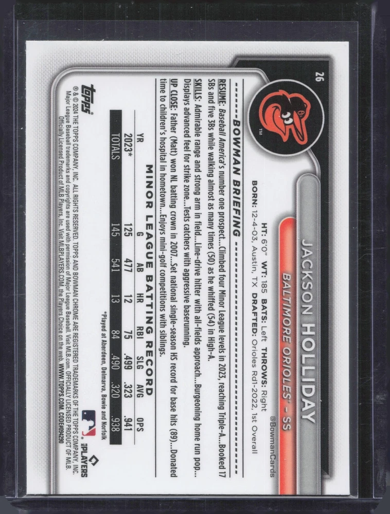 Season: 2024 League: MLB Sport: Baseball Team: Baltimore Orioles Type: Sports Trading Card Set: 2024 Bowman Chrome Player/Athlete: Jackson Holliday Manufacturer: Bowman Autographed: No Graded: No Year Manufactured: 2024