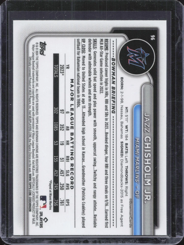 Player/Athlete: Jazz Chisholm Jr. Sport: Baseball Season: 2024 Autographed: No Team: Miami Marlins Type: Sports Trading Card Year Manufactured: 2024 League: MLB Manufacturer: Bowman Set: 2024 Bowman Chrome Graded: No