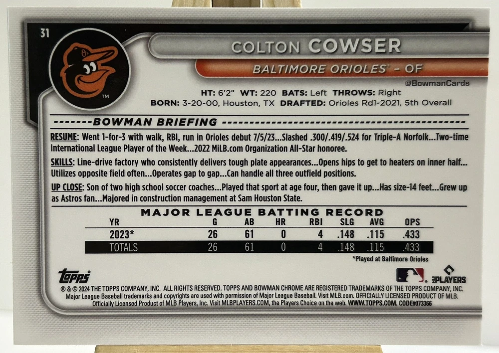 This 2024 Bowman Chrome Mega Box Mojo Colton Cowser #31 trading card is a must-have for any baseball fan. Featuring a parallel/variety design, this sports trading card showcases the Baltimore Orioles player in all his glory. The card is part of the Major League (MLB) set and is manufactured by Bowman, a well-known name in the industry. The Mojo card is a great addition to any collection and is perfect for those who love to trade sports memorabilia. Its unique features make it stand out from the rest and give collectors a reason to add it to their collection. Get your hands on this 2024 Bowman Chrome Mega Box Mojo Colton Cowser #31 trading card today and add it to your collection!