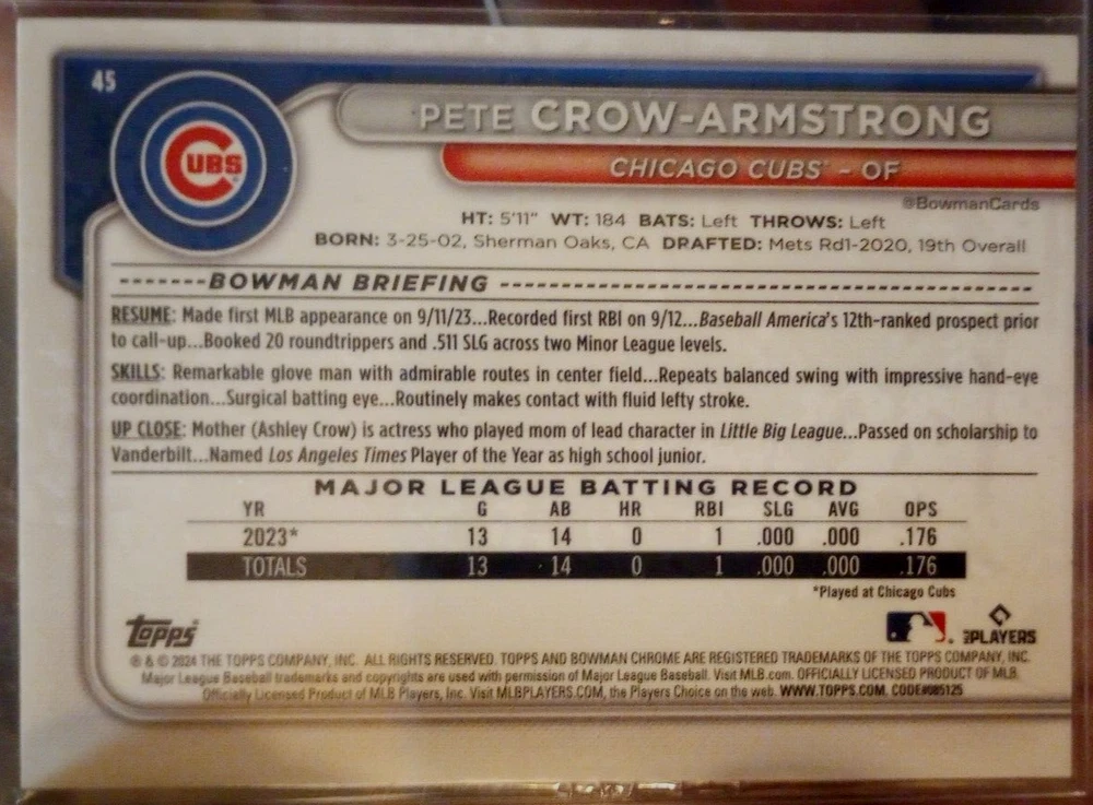 This rare and highly sought-after 2024 Bowman Chrome baseball card features the promising rookie Pete Crow-Armstrong in his Chicago Cubs uniform. The card is a true gem for collectors and fans alike, with its stunning Refractor Image Variation parallel/variety and short print status. As a Sports Trading Card, this 2024 Bowman Chrome card is a must-have for any serious collector. The card is exclusive and comes from the Image Variation SP insert set. It is a True Rookie IV Refractor card, with RC standing for Rookie Card. The card number is 45 and it was manufactured by Bowman in 2024. Don't miss your chance to add this rare card to your collection today