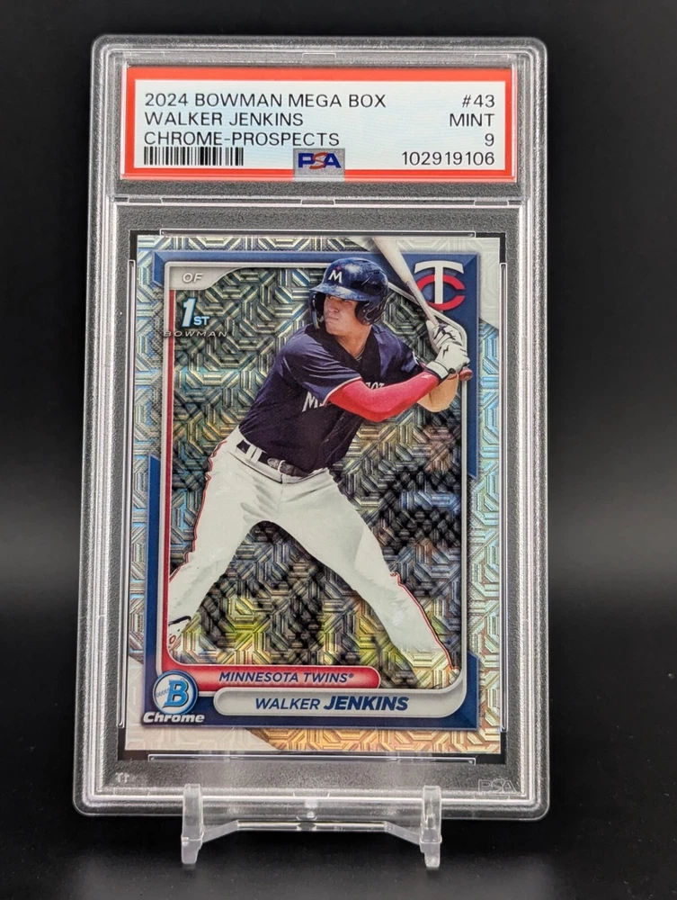 This is a rare and highly sought-after 2024 Bowman Chrome sports trading card featuring Walker Jenkins, a promising rookie from the Minnesota Twins team. The card is part of the Mega Box Mojo Refractor parallel/variety and boasts a range of exciting features, including being framed and having a hologram, short print, and 1st edition chase. It's a must-have for any baseball fan and collector, especially those who appreciate Topps's limited edition and exclusive collectibles. With its unique design and stunning visuals, this card is sure to be a standout addition to any collection. Don't miss your chance to own a piece of baseball history!