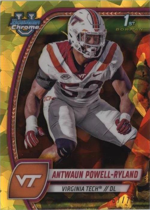The 2024 Bowman Chrome University Sapphire Antwaun Powell-Ryland #15 Yellow Bowman 1st /75 trading card features the National Collegiate Athletic Association (NCAA) football player Antwaun Powell-Ryland on a standard-sized card stock. This Rookie 1st Edition card is part of the 2024 Bowman Chrome University set, with a limited print run of 59 out of 75, making it a rare collectible item for fans and collectors. The card is in near mint or better condition, adding to its value and appeal in the sports trading card market.
