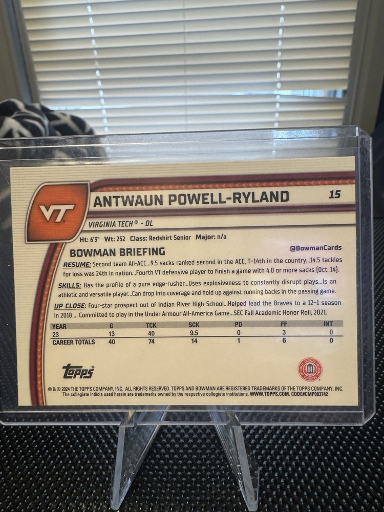 This Antwaun Powell-Ryland rookie card is a must-have for collectors! The vibrant yellow parallel /75 makes it stand out, and the Sapphire finish gives it a premium look. As a limited Bowman 1st Edition, it’s a rare find with serious future potential. The near-mint condition ensures it’s ready for display or your investment portfolio. A fantastic grab for any NCAA football fan!