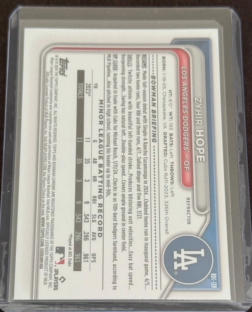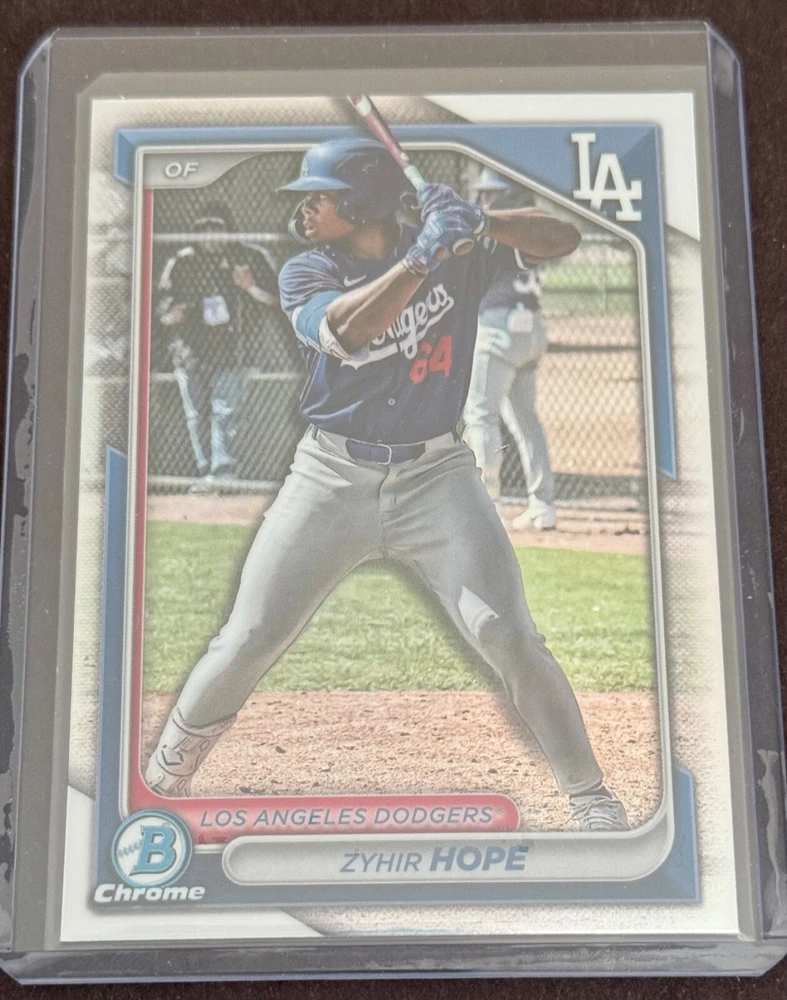 The product is a 2024 Bowman Chrome trading card featuring Zyhir Hope, a prospect for the Los Angeles Dodgers in Major League Baseball. This particular card is a Chrome Refractor parallel from the set, making it a collectible item for fans and collectors of baseball trading cards. As the card is not autographed, it is likely to appeal to those interested in the player's potential and the unique design of the Chrome Refractor variation. Hope first Bowman Non Auto card. Please review the pics for card condition or ask questions before buying. No Returns will be accepted.