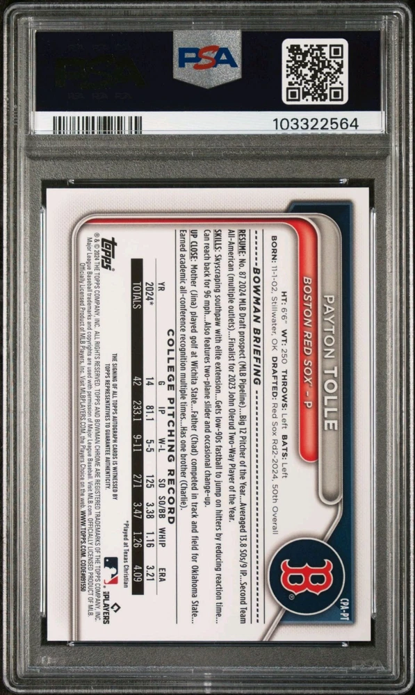 The product is a 2024 Bowman Chrome Draft baseball trading card featuring Payton Tolle of the Boston Red Sox. This limited edition card is autographed by Tolle and includes an authentication from Topps. With a print run of 150 and a hard-signed autograph, this card is a part of the HTA Choice parallel variety. It is a highly sought-after collectors' item, especially for fans of Tolle and rookie card collectors.