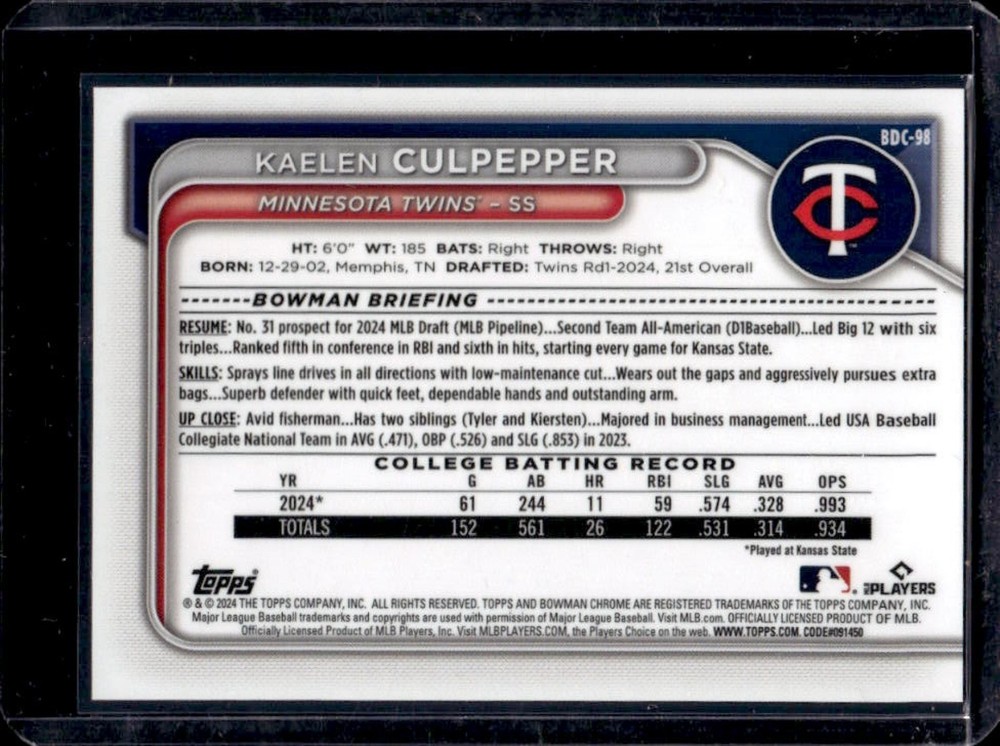 2024 Bowman Draft Sapphire Kaelen Culpepper Selections #SS-15 Twins