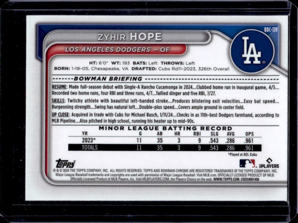 2024 Bowman Draft Zyhir Hope Chrome Prospect Refractor #BDC-139 Dodgers