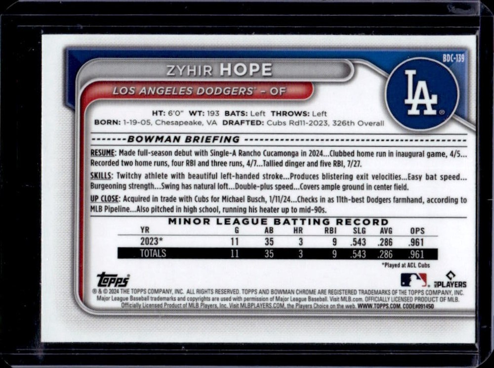 2024 Bowman Draft Sapphire Zyhir Hope Chrome Prospect #BDC-139 Dodgers