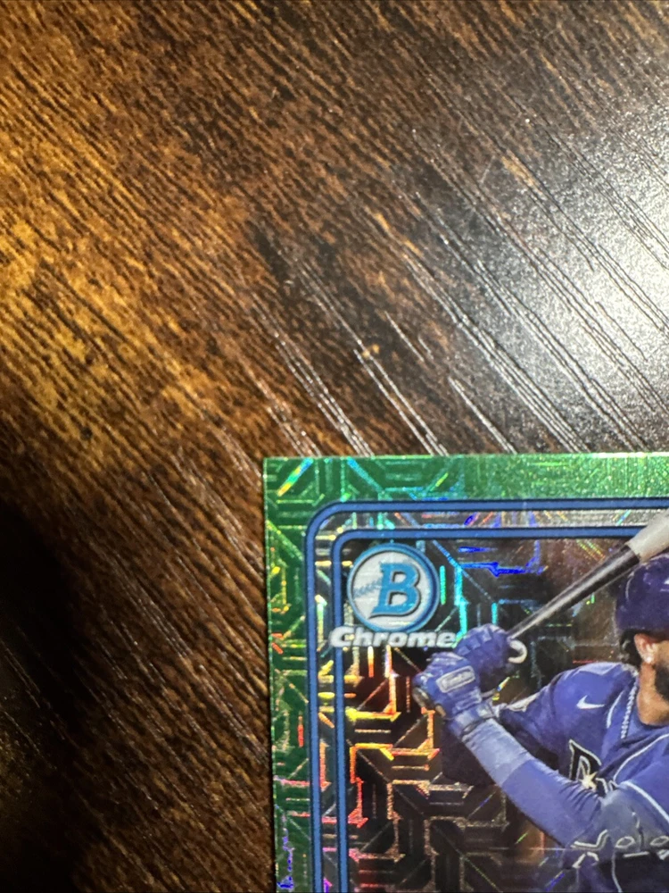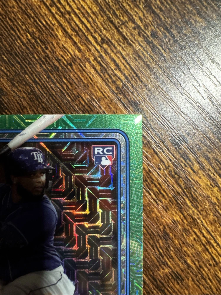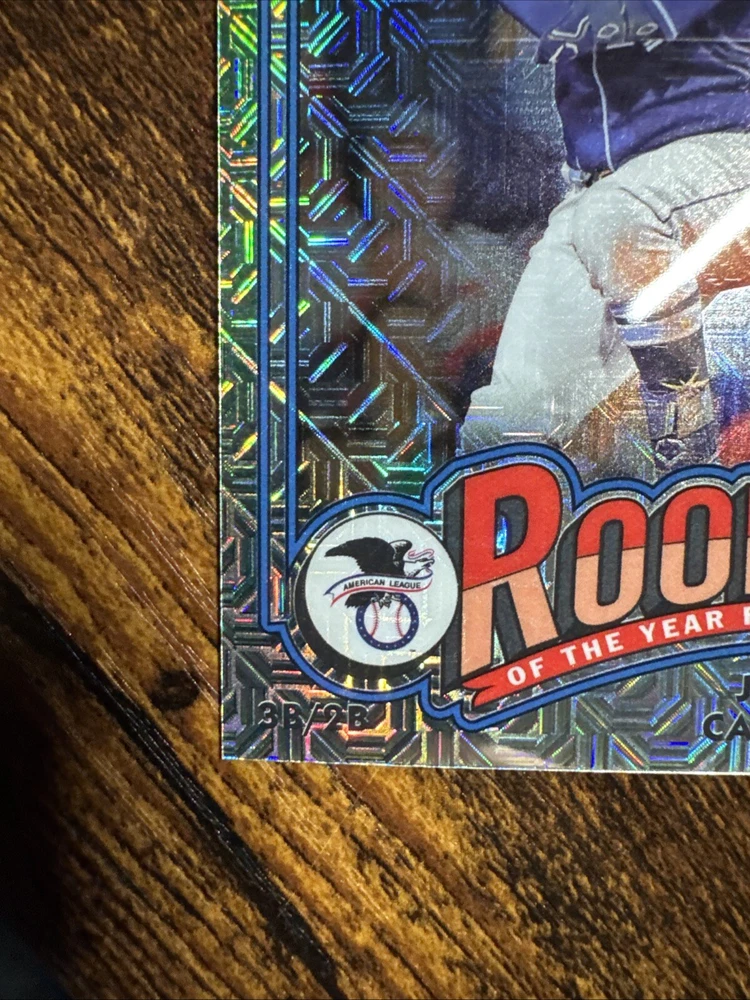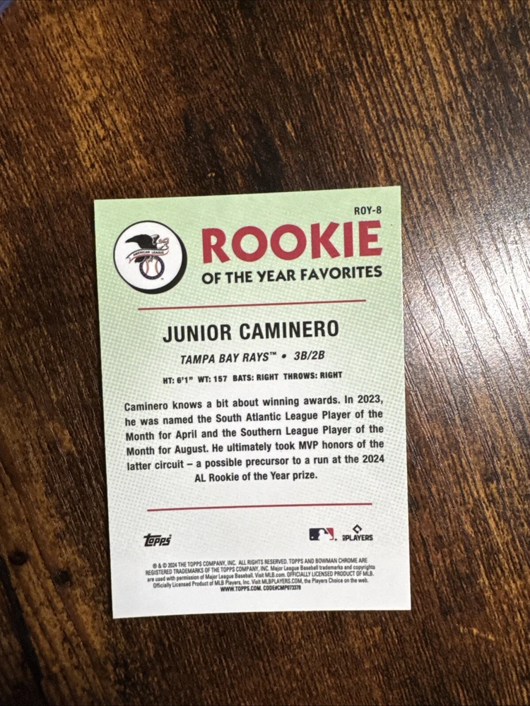 The product is a 2024 Bowman Mega Box Chrome Rookie of the Year Favorites trading card featuring Junior Caminero from the Tampa Bay Rays. This sports trading card is part of an insert set manufactured by Topps in the Major League Baseball (MLB) league. The card number is ROY-8 and it is a rookie card, highlighting Caminero as a promising new talent in the 2024 season. The chrome finish adds a premium touch to the card, making it a desirable collectible for fans and card enthusiasts.