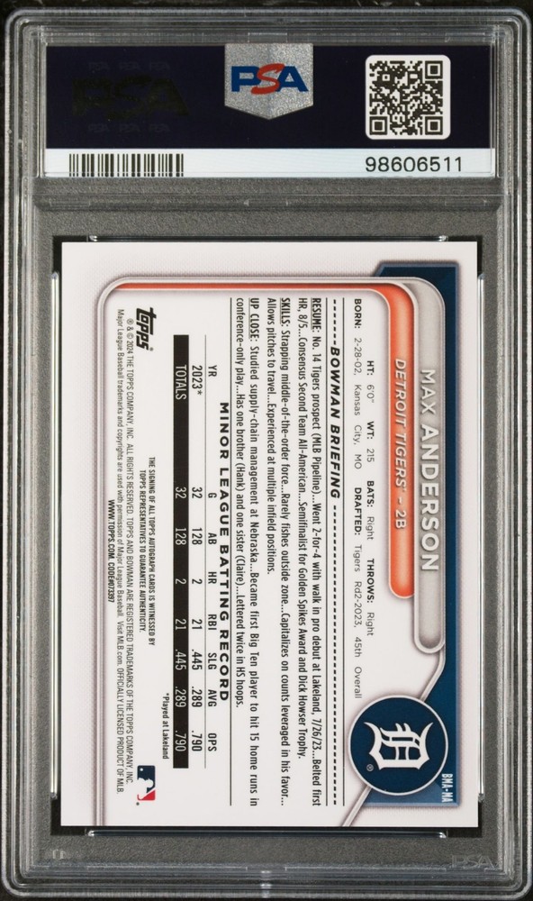 Feast your eyes on this magnificent 2024 Bowman MA Max Anderson Mega Box Blue /150 PSA 10 Gem Mint Detroit Tigers Auto card. As a part of the esteemed Bowman brand, this card bears the legendary signature of Max Anderson, a name that resonates with every sports enthusiast. With a scarce production run of only 150, this card is an absolute rarity, making it an enviable addition to any sports card collection. The card is embellished in a stunning shade of Mega Box Blue, a hue that is as rare as it is beautiful. The card number, 'MA', further adds to its uniqueness. But what truly sets this card apart is its PSA 10 Gem Mint rating. This perfect score is a testament to the card's impeccable condition and superior quality, promising an unblemished surface, sharp corners, and vivid colors. This is far more than just a card, it's a piece of sports history that lets you own a moment in time from the illustrious career of Max Anderson. Perfect for both avid collectors and casual fans, this card is a testament to the thrill and excitement of the game. Whether you're looking to complete your collection, or find that unique gift for a sports lover, this card is sure to impress. Immerse yourself in the world of sports and let this Max Anderson card be the crown jewel of your collection. Don't miss the chance to own this exquisite piece of memorabilia. Remember, magic happens when you believe in the game!