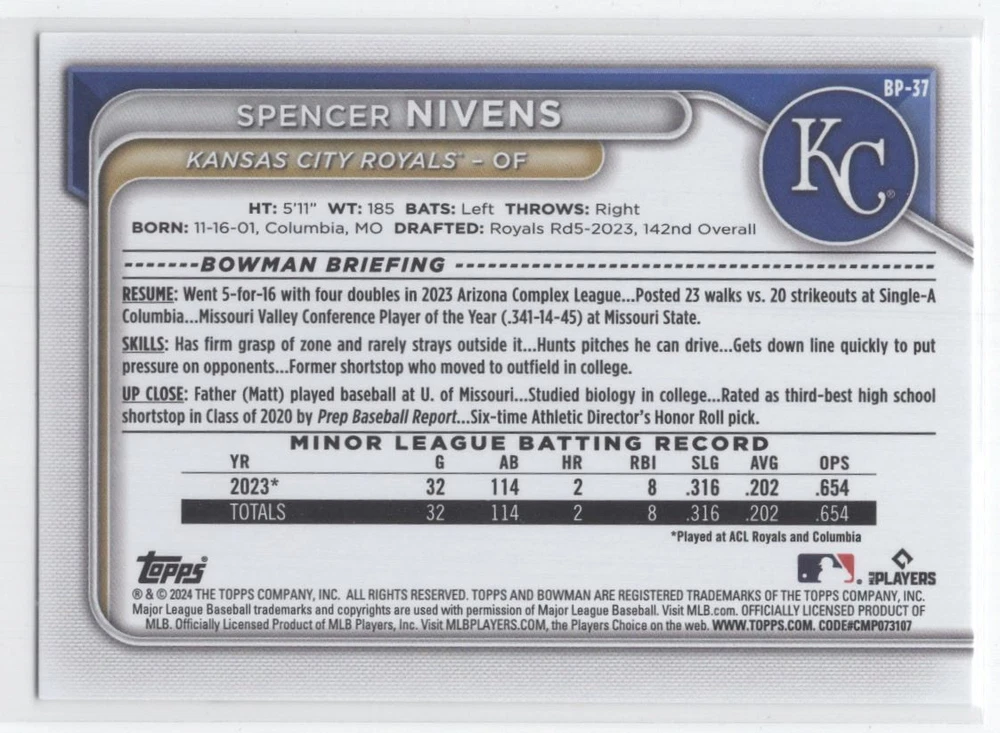 About Me Other Listings Feedback Add to Favorites Contact Me eBay Store Striking Cards 901 2024 Bowman Prospects Spencer Nivens Kansas City Royals #BP-37 No stock photo / These are real scans or pictures Details Description: Spencer Nivens Category: Baseball Year: 2024 Product: Bowman Prospects Team: Kansas City Royals Card Number: BP-37 Dimensions: 3½" x 2½" SKU: BL B0001 R01 T (81) Listing By Kronocard trading cards software v2.7.0.1