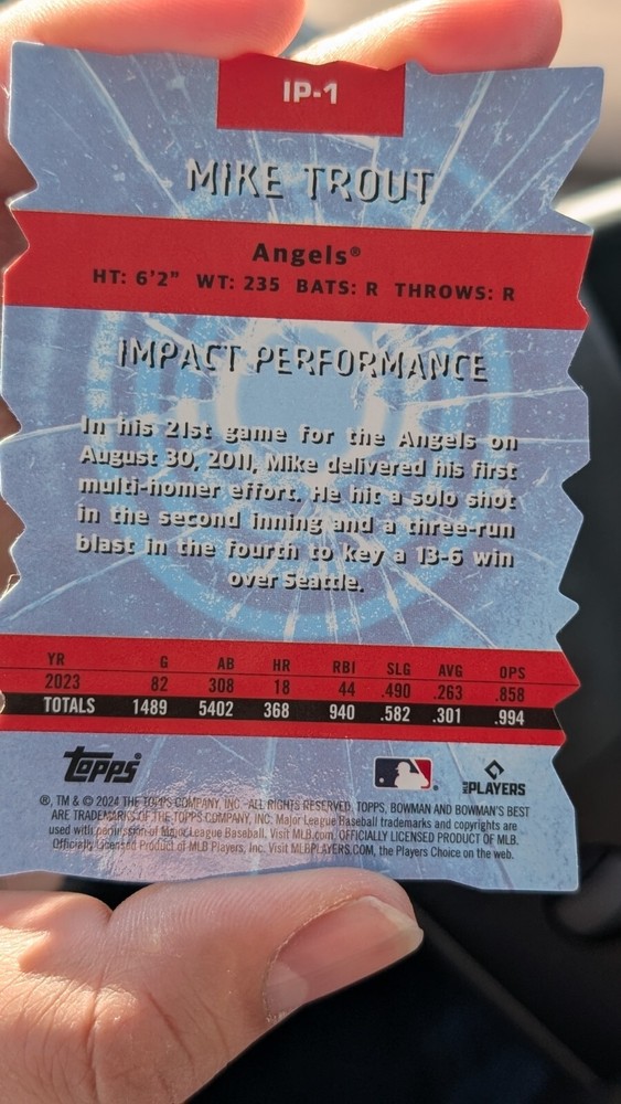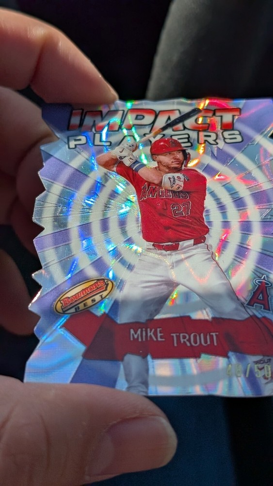 Elevate your baseball card collection with the 2024 Bowman's Best Mike Trout Impact Players Refractor. This limited edition card showcases the exceptional craftsmanship of Topps with its holographic design and premium card stock material. It features the iconic Los Angeles Angels player, Mike Trout, and is part of the esteemed Impact Players Bowman's Best insert set, promoting the game's most exciting and talented athletes. As a cherished piece of memorabilia, this card is numbered IP-1 and is a must-have for any serious collector or fan of the sport. Its chase card status, combined with its exclusivity as a promo and collectors edition, makes it a standout addition. Celebrate the MLB World Series season and Trout's impactful career with this stunning refractor card.