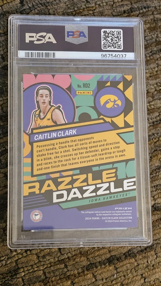 This rare 2024 Panini Caitlin Clark Collection #RD2 card features the standout Indiana Fever and Iowa Hawkeyes player in her Razzle Dazzle rookie card. The card is made of high-quality card stock and has been professionally graded by PSA with a perfect 10 grade. With its Mosaic parallel and short print insert, this card is a must-have for any basketball fan, especially those who follow the Women's National Basketball Association (WNBA) and National Collegiate Athletic Association (NCAA). Don't miss out on the chance to add this original, English-language card to your collection.