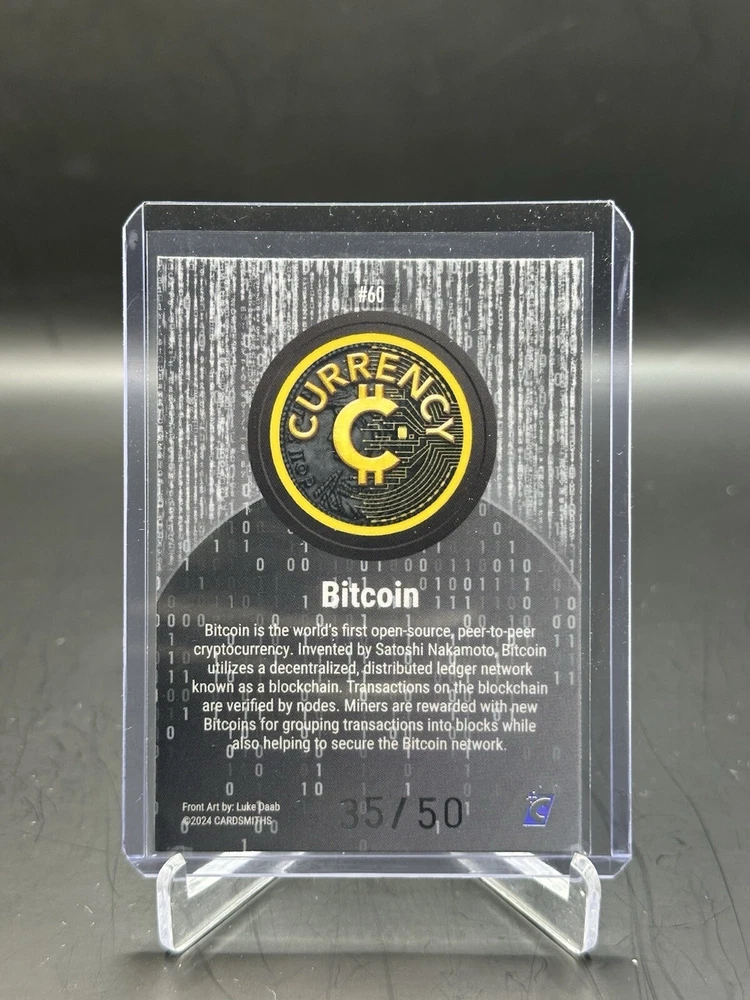 This rare 2024 Cardsmiths Currency Series 3 Bitcoin card is a must-have for any collector. The card features a stunning silver refractor design with a holographic mint finish. It is numbered 35/50 and made of 20 pt. card stock material. The card showcases the Bitcoin character and is part of the Series 3 insert set. It is an original and licensed reprint by the manufacturer, Cardsmiths. The card is in standard size and in English language. It is suitable for non-sport trading card enthusiasts aged 14+. The card was manufactured in the United States and is a part of the Currency and History genres. Card is in MINT condition and is ready to be graded!