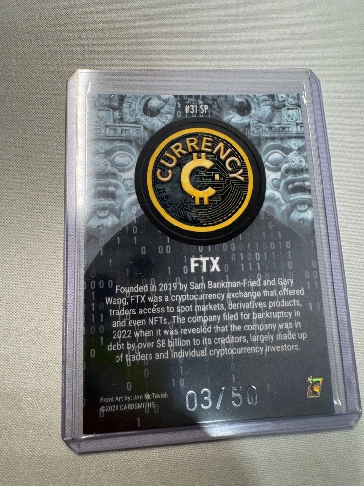This is a rare short print (SP) (#3 of 50) Cardsmiths Currency SILVER "Gemstone Refractor" Card from the Series 3 set, Card #31-SP titled "FTX". Card art by Jon McTavish. This card was taken directly from the pack and placed in a penny sleeve and top loader upon opening, so it is in mint/near mint condition for the collectors out there! Shipping & Packaging: Card in penny sleeve and top loader will be packed carefully in a bubble mailer. It will be secured between 2 pieces of cardboard and placed inside the bubble mailer for extra protection during transit. *** NOTE *** Orders over $250 USD will be shipped in a USPS Priority Mail small flat rate box for extra protection during shipping. Can combine shipping if buying multiple cards. About Cardsmiths Currency Cards: The Cardsmiths Currency series takes collectors on a journey from the earliest days of civilization where mankind first bought, sold, and bartered for basic goods required for survival, to the present day, where technology, digital banking, and crypto power the world of commerce. Cards in this set range from persons of influence, memes, artifacts, and forms of money that have played an important role in development of civilization and the economy of today.