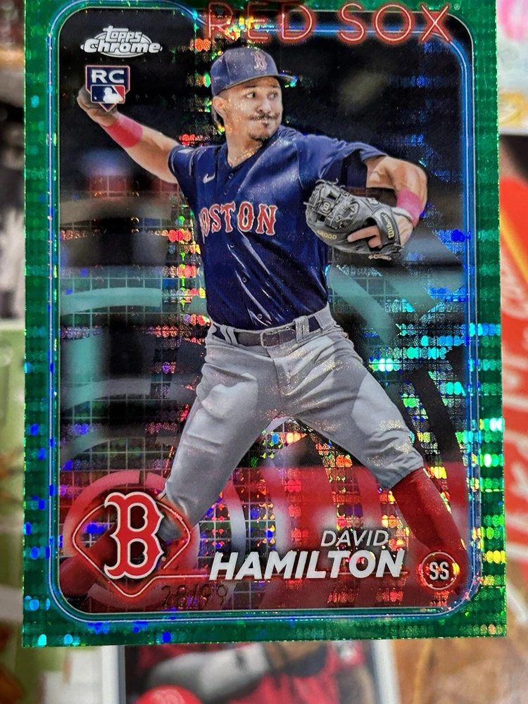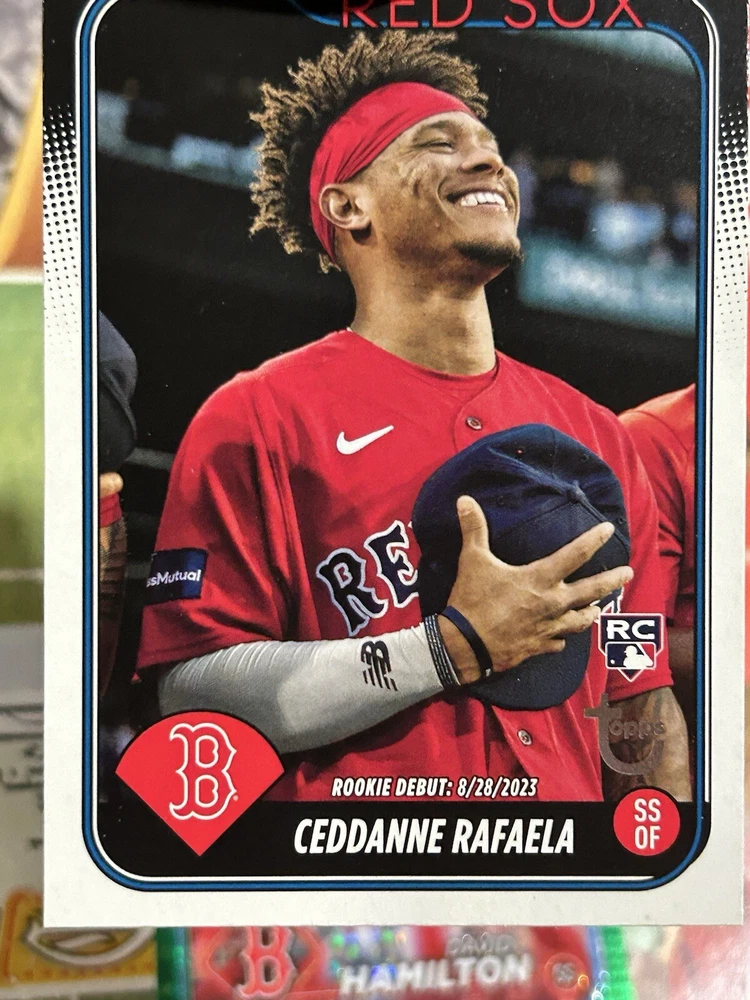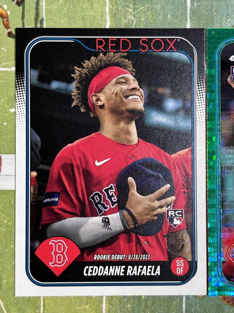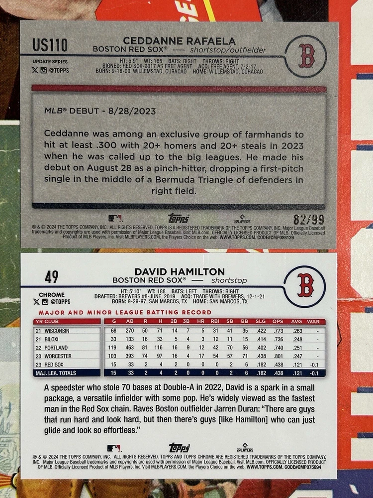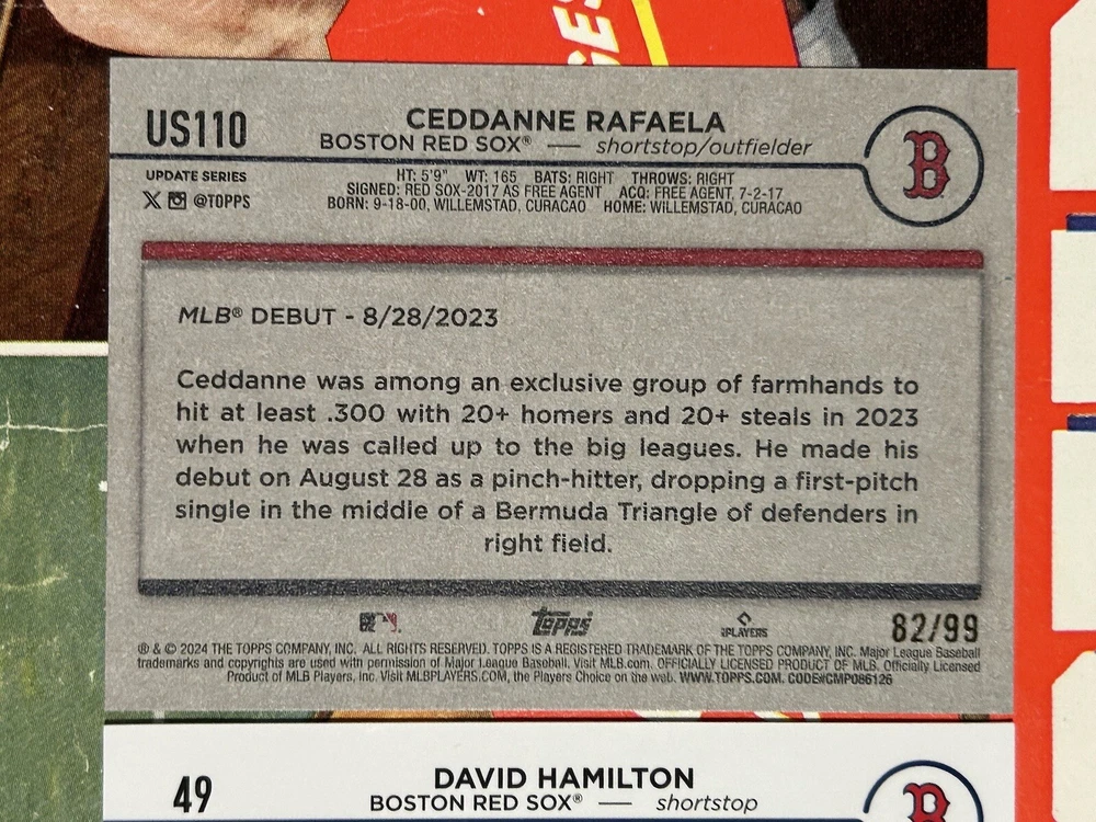 **** Also included is 2024 David Hamilton (RC): Topps Chrome- Green Sonar Refractor RC 28/99 #49. Thanks! **** This 2024 Topps Update Series sports trading card features Ceddanne Rafaela of the Boston Red Sox. The card is part of the Vintage Stock RC SP /99 parallel/variety and is serial numbered. It is a near mint or better conditioned card and is ungraded. The card is from the 2024 season and is a great addition to any baseball card collection. It is a base set rookie card and is manufactured by Topps. The card is perfect for fans of the Major League Baseball (MLB) and collectors alike.