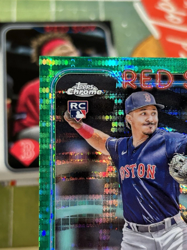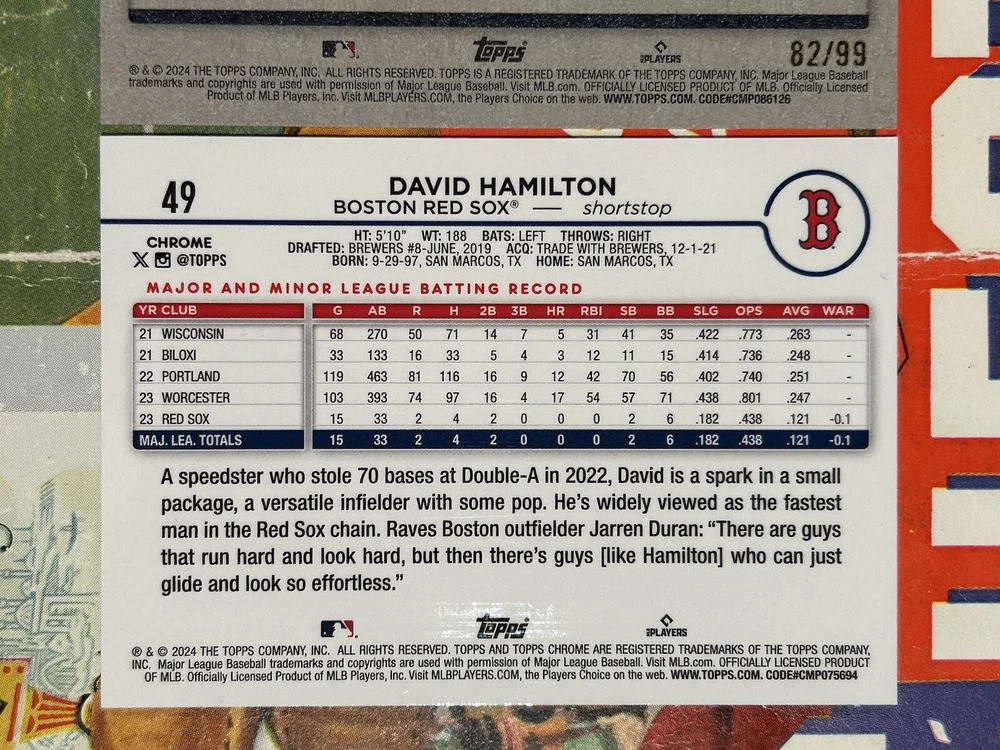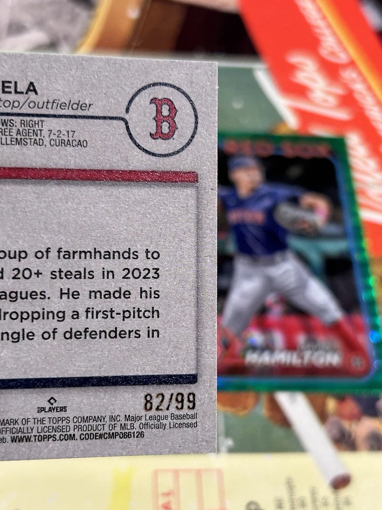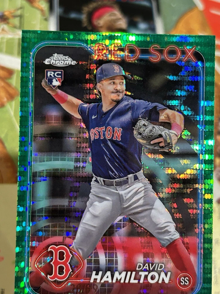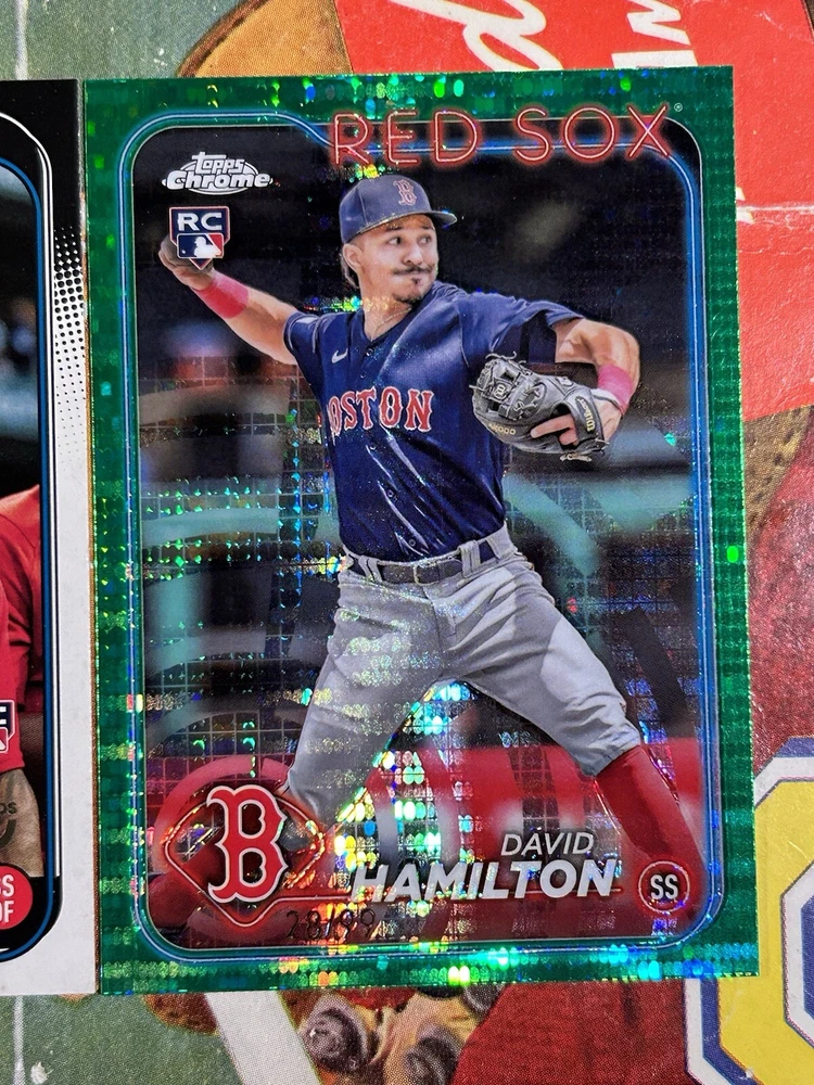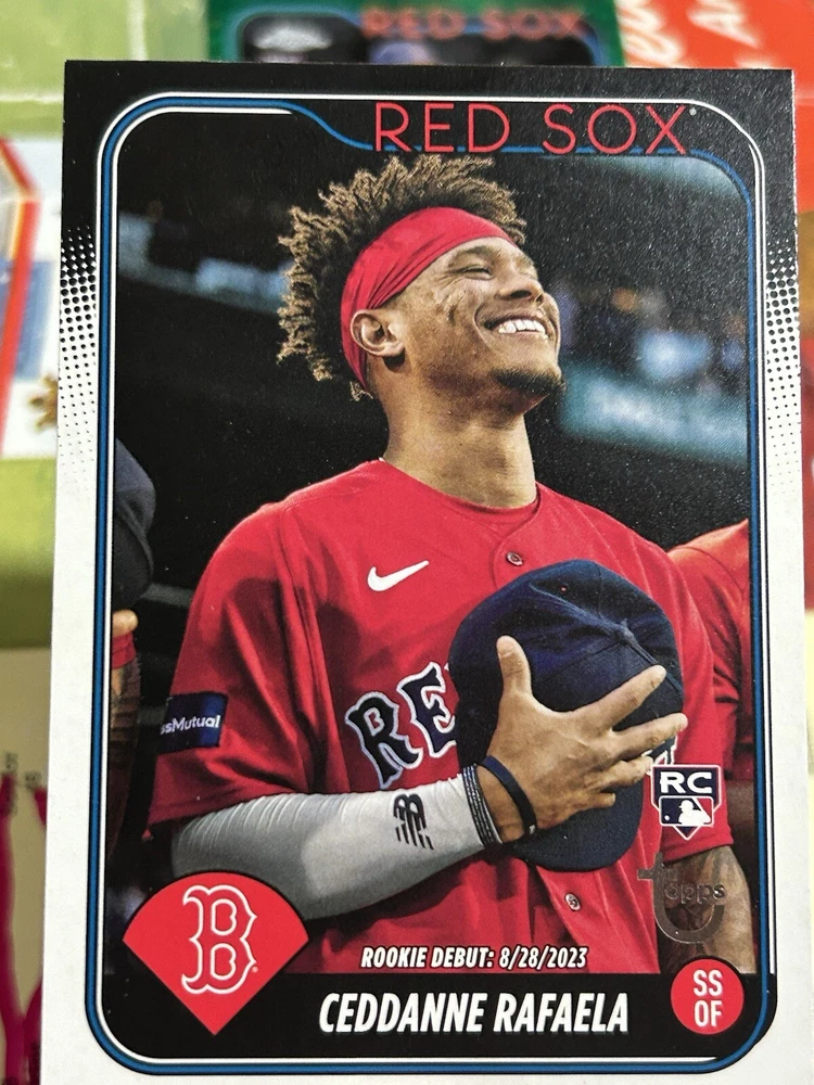**** Also included is 2024 David Hamilton (RC): Topps Chrome- Green Sonar Refractor RC 28/99 #49. Thanks! **** This 2024 Topps Update Series sports trading card features Ceddanne Rafaela of the Boston Red Sox. The card is part of the Vintage Stock RC SP /99 parallel/variety and is serial numbered. It is a near mint or better conditioned card and is ungraded. The card is from the 2024 season and is a great addition to any baseball card collection. It is a base set rookie card and is manufactured by Topps. The card is perfect for fans of the Major League Baseball (MLB) and collectors alike.