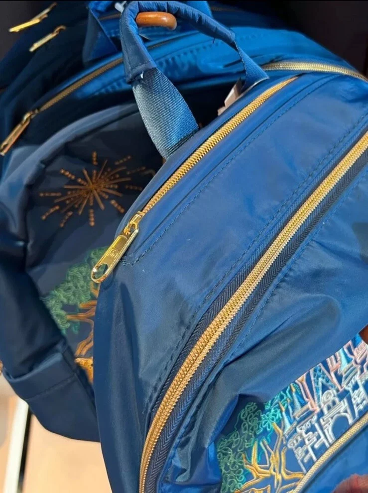 The product is a 2024 Disney World Blue 4 Parks Icons Castle Epcot Embroidered 16" Backpack from the Disney brand. It features iconic Disney World symbols like the castle and Epcot, and is part of the 2024 4 Park Icon Collection event. This collectible item showcases characters and themes from Disney World Magic, Epcot, Mickey, AK, and Hollywood.