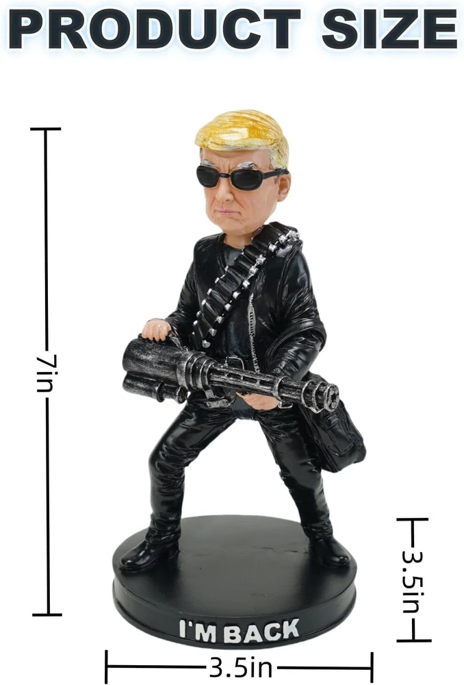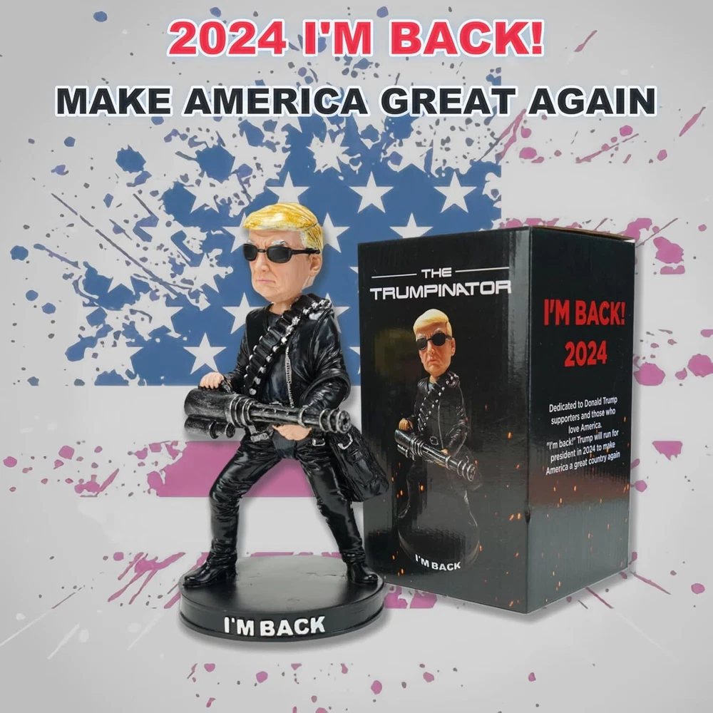 Experience the Upgraded 2024 Trump Bobblehead: Featuring a fresh design with the bold statement "I'm back!" symbolizing Trump's anticipated return in the 2024 election! Crafted with Precision: Hand-painted to perfection, the Trumpinator Bobblehead 2024 exhibits exquisite details suitable for devoted Trump supporters and patriots—making it an ideal Trump-themed gift. Distinctive Design: This Donald Trump merchandise features a uniquely stylized the Trumpinator holding a Gatling, which is very cool and appeals to many collectors and enthusiasts. Versatile Decor Piece: From offices to homes and cars, this Trump bobble head enhances any space. An excellent choice for birthdays, holidays, Christmas, and various occasions—it also makes a great Trump gift for Trump admirers. Elegant Presentation: Delivered in an intricately designed gift box featuring Trump's likeness and campaign slogan, this Trump bobblehead promises to delight as a whimsical and memorable Trump-themed present. Product Description