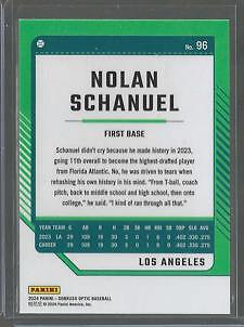This is a nice example of a 2024 Donruss #96 Nolan Schanuel Optic Other important information about this card: In 2024 Nolan Schanuel played for the Los Angeles Angels. Please check out our other listings for more great cards.
